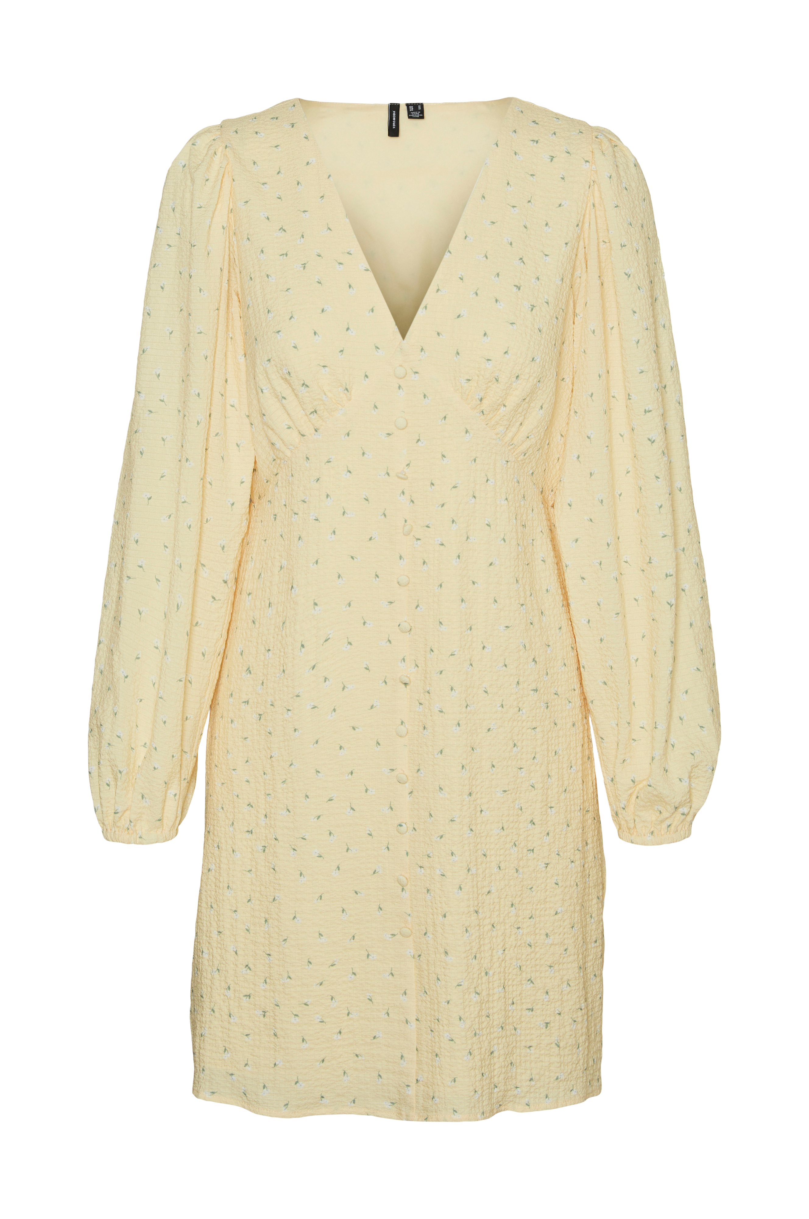 • Kort kjole• V-udskæring• Dekorative, beklædte knapper foran• Ballonærmer med elastiske manchetter• Vævet for• Længde: 86 cm i størrelse S