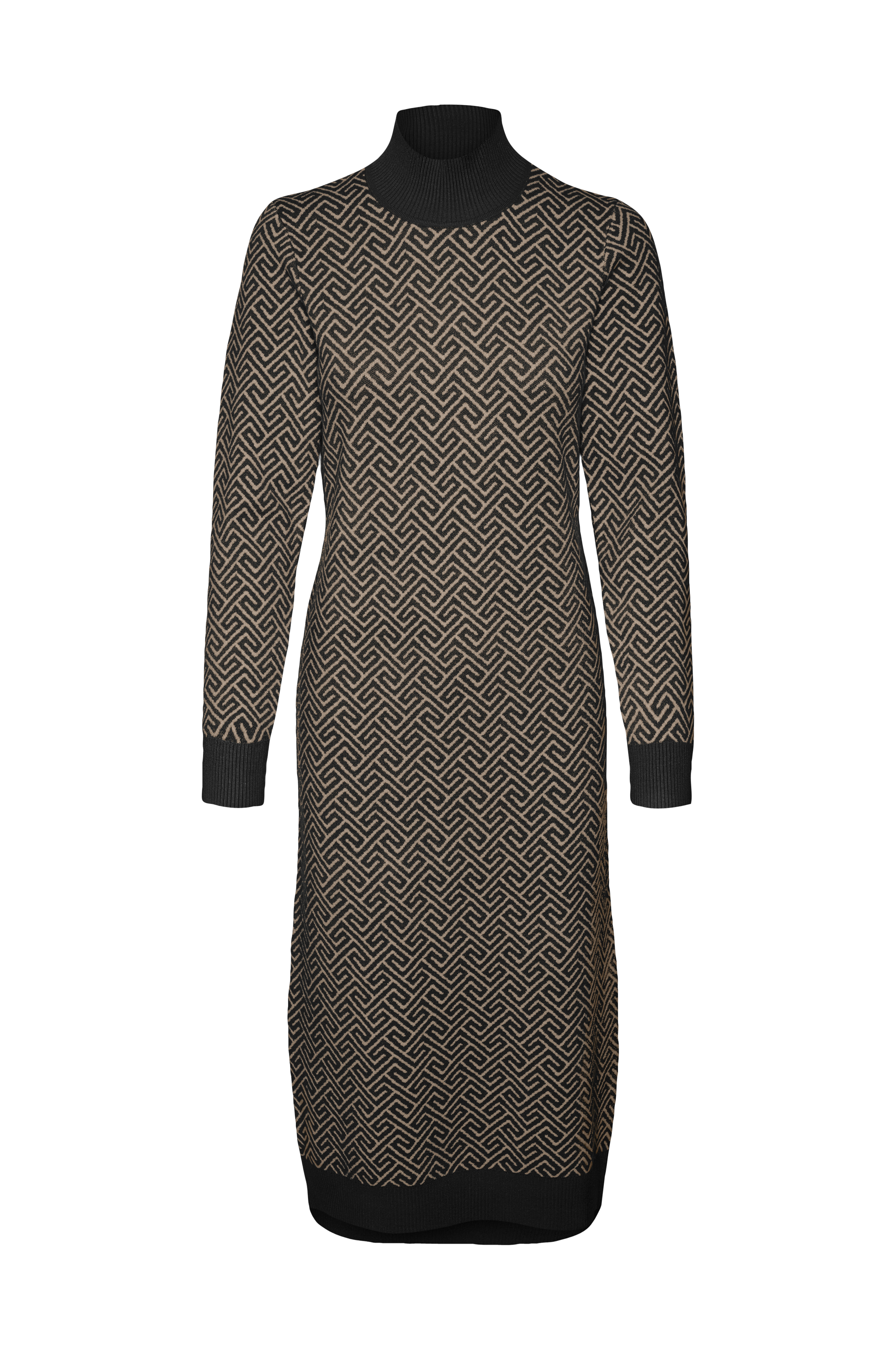 • Figursyet, mønsterstrikket model• Høj, ribstrikket krave• Langt ærme• Ribstrik ved manchetterne og nederst• Længde: 110 cm i størrelse XS
