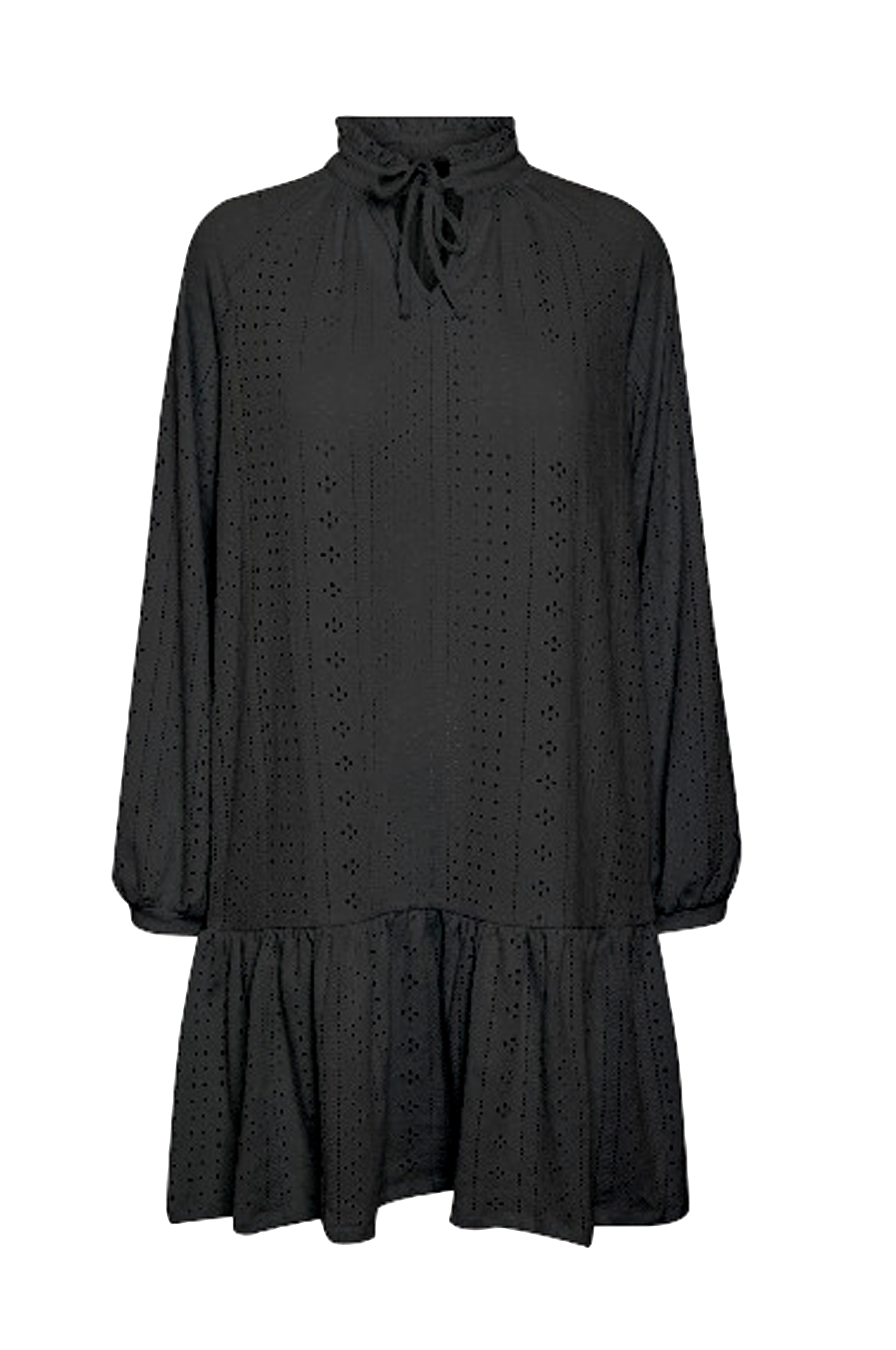 • Kort kjole med hulmønster• Ventilation med bindebånd i halsen• Volant i halsen• Lange ærmer• Volant nederst• Længde: 88 cm i størrelse S