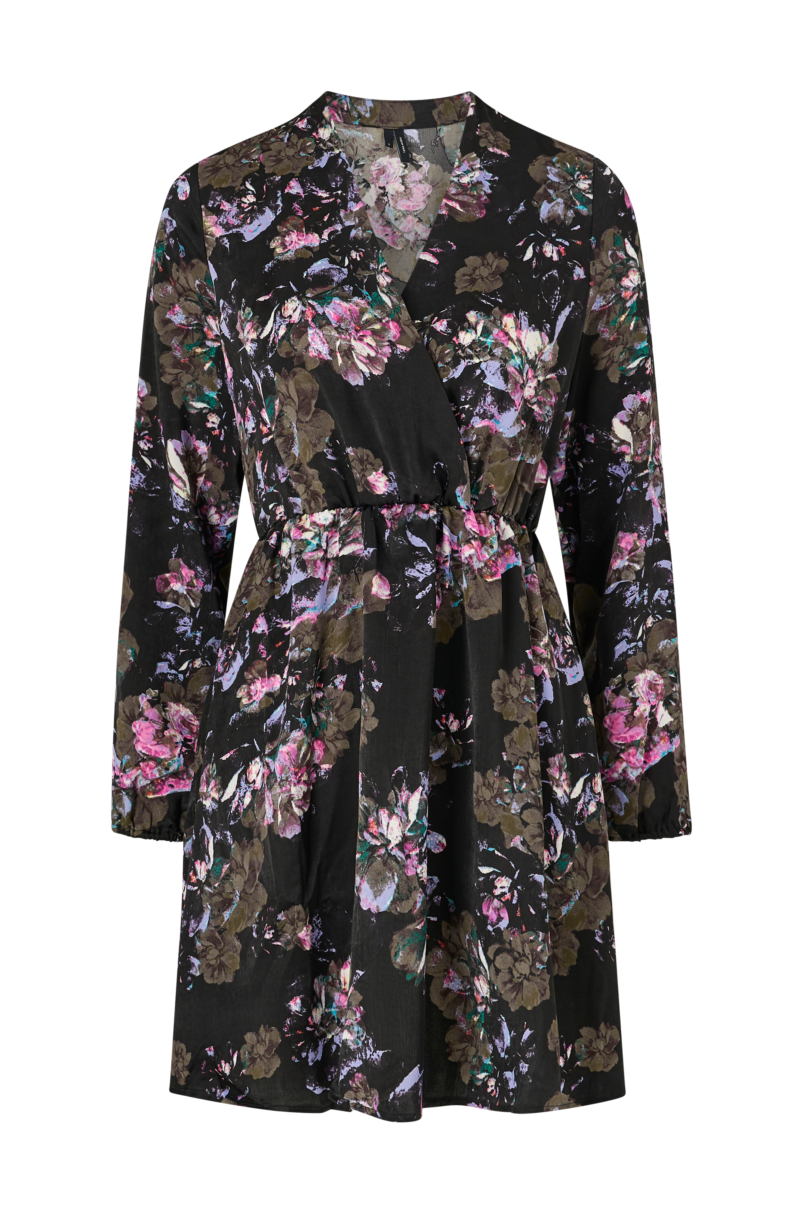 Kjole vmEmilia L/S Wrap Dress fra Vero Moda med elastisk talje, v-udskæring med slå-om og langt ærme med elastisk ærmekant. I vævet kvalitet med glans. Længde ca. 91 cm i str. S.