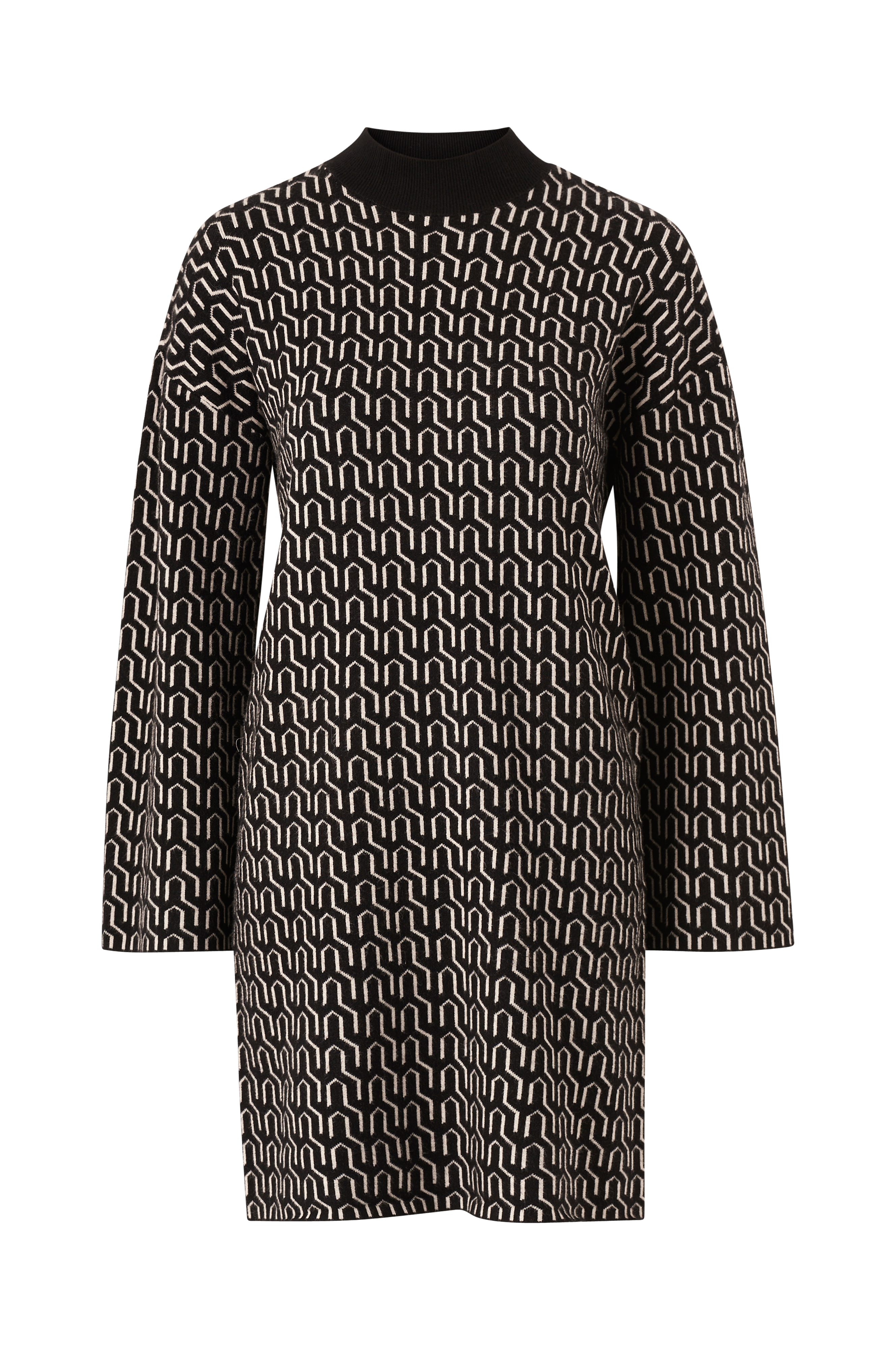 • Uformel, mønstret model• Halvhøj, ribstrikket krave• Nedsænket skulder med langt ærme• Længde: 90 cm i størrelse S