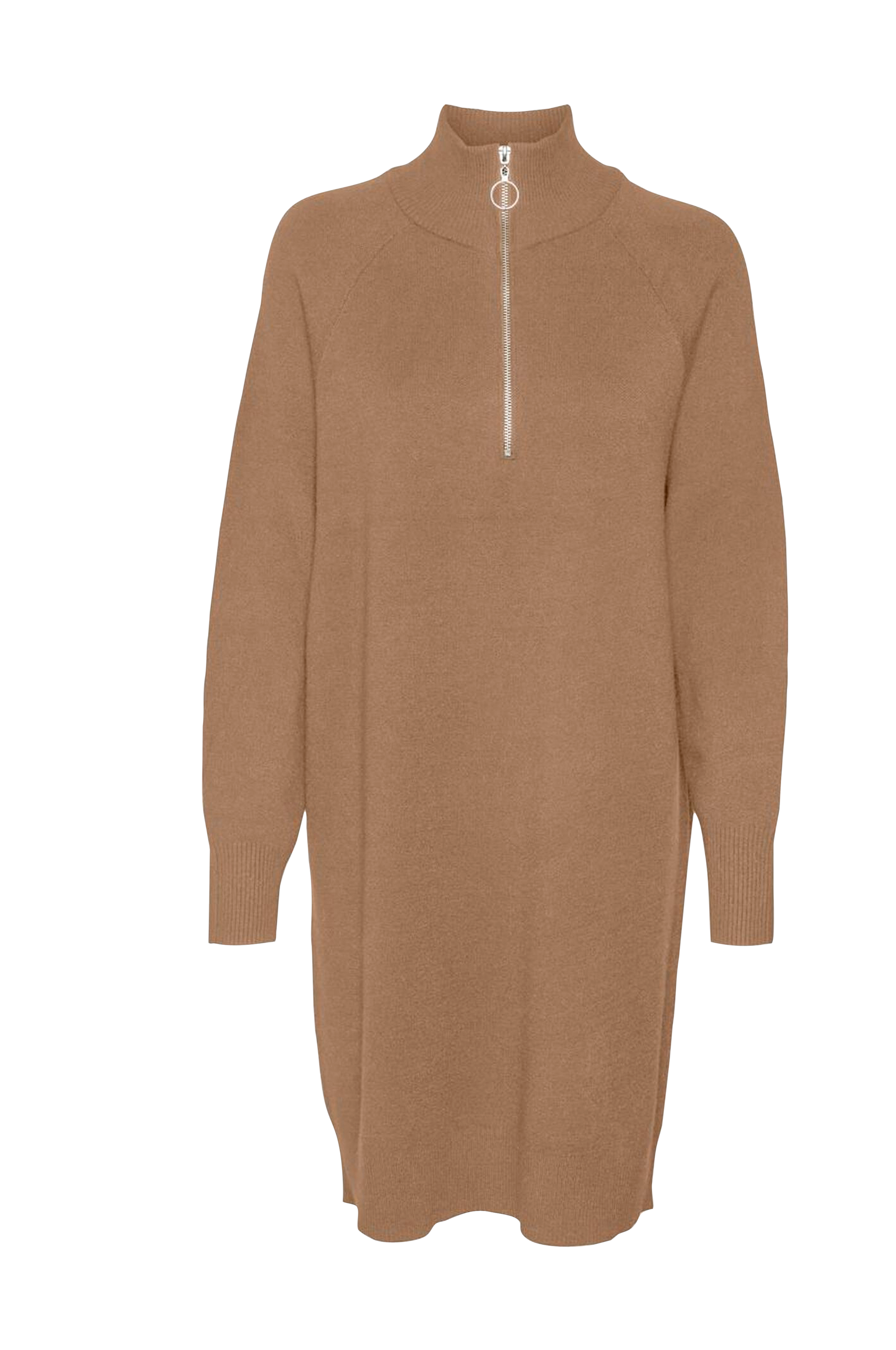Strikket, langærmet kjole i blød viskoseblanding. Høj, ribstrikket hals og halvlang lynlås. Raglanærmer. Ribkant i ærmekant og forneden. Længde ca. 87 cm i str. S.