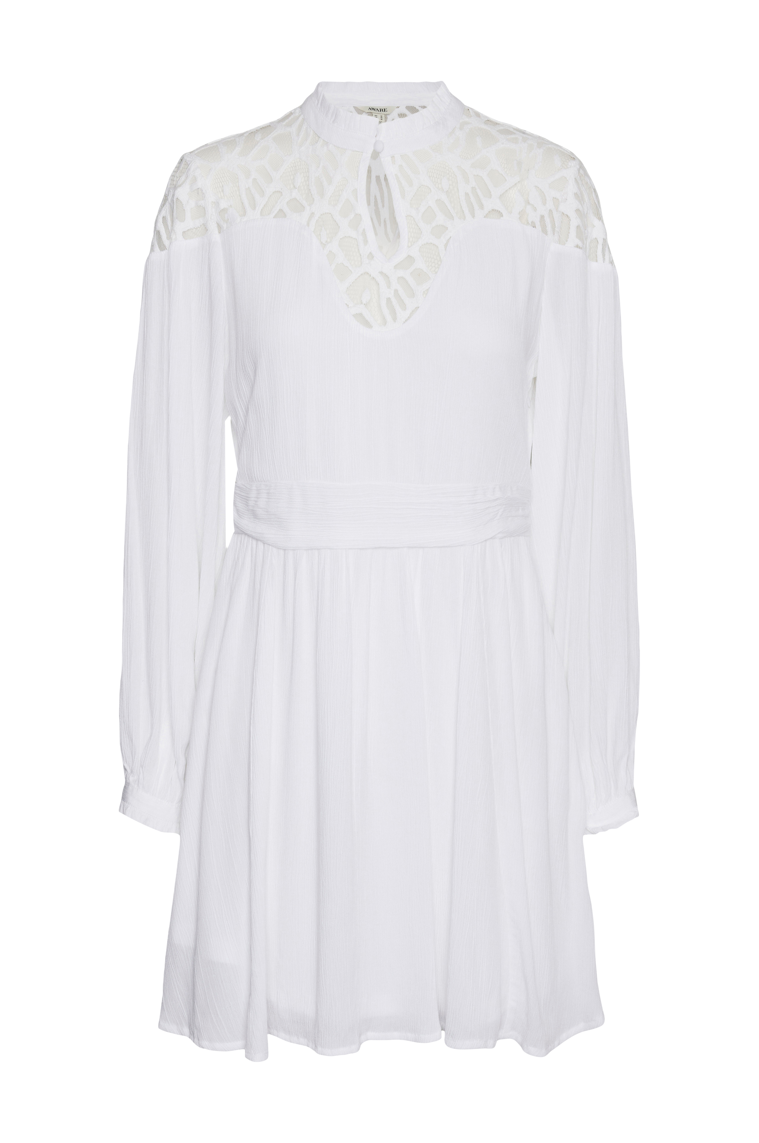 • Kjole i rynket viskose• Transparent blonde på toppen• Ventilation med knap foran• Ballonærmer med flæsekant• Bindebælte• Trikotfor• Længde: 86 cm i størrelse S