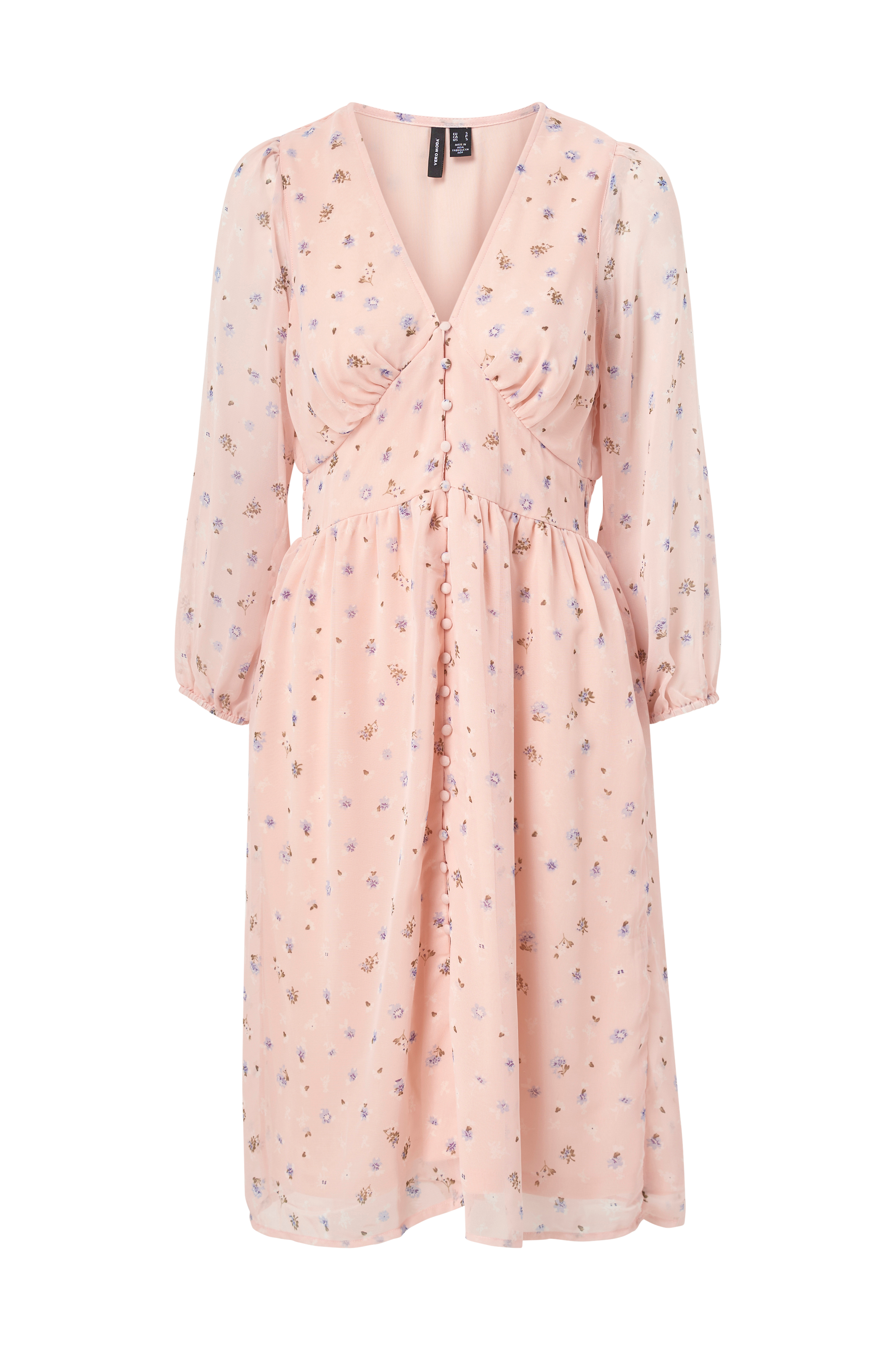 • Læglængde kjole i chiffon • V-udskæring • Stofbetrukkede knapper foran • Defineret talje med smock bagpå • Lange, transparente ærmer med elastiske manchetter • Trikotfor • Længde: 103 cm i størrelse S • Produktet indeholder genindvundet materiale, som genbruges for at reducere mængden af affald samtidigt med at der ikke anvendes nye ressourcer.