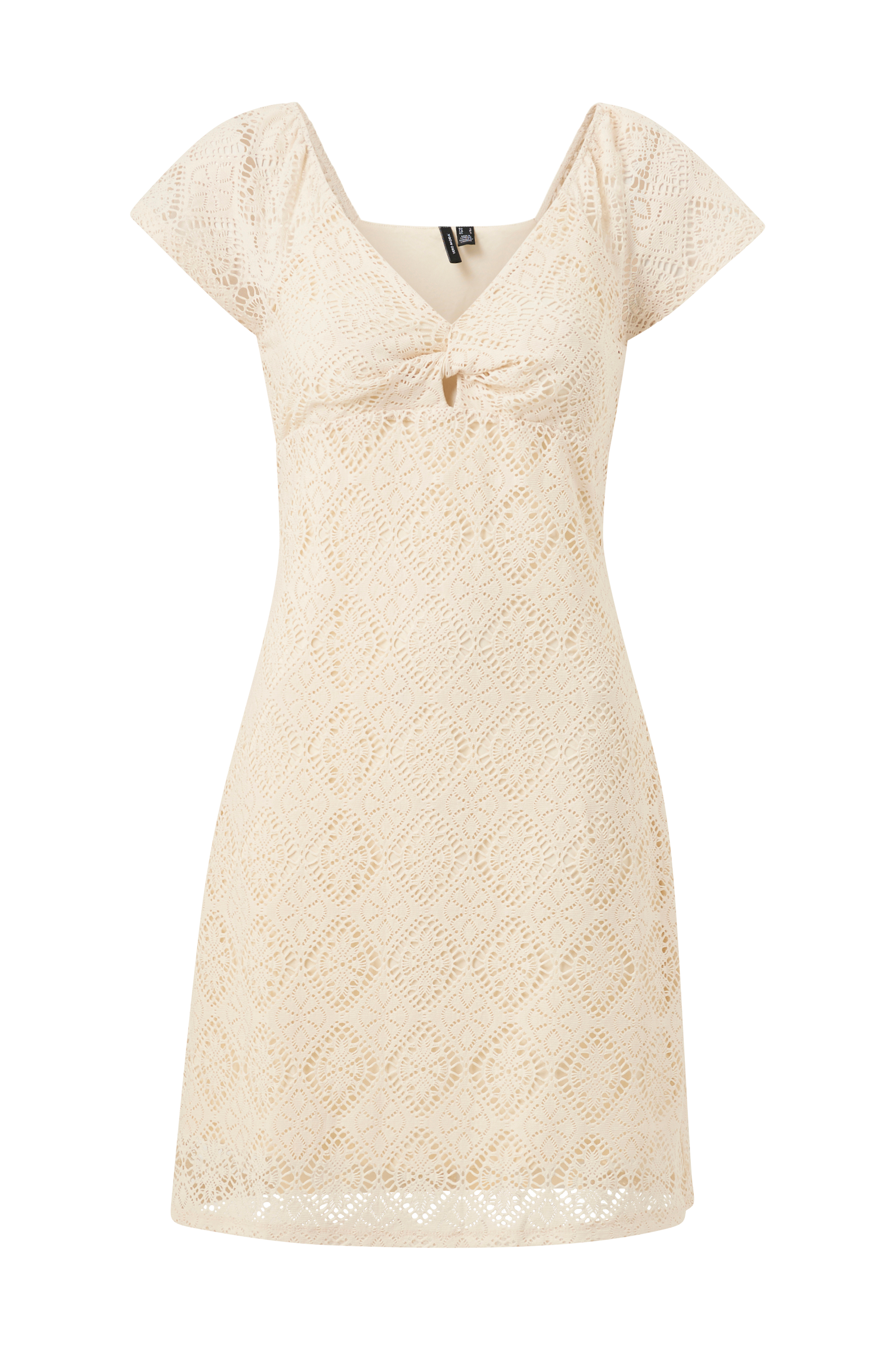 • Kort kjole i elastisk blonde• V-udskæring med knudedrapering• Korte ærmer• Foret• Længde: 91 cm i størrelse S
