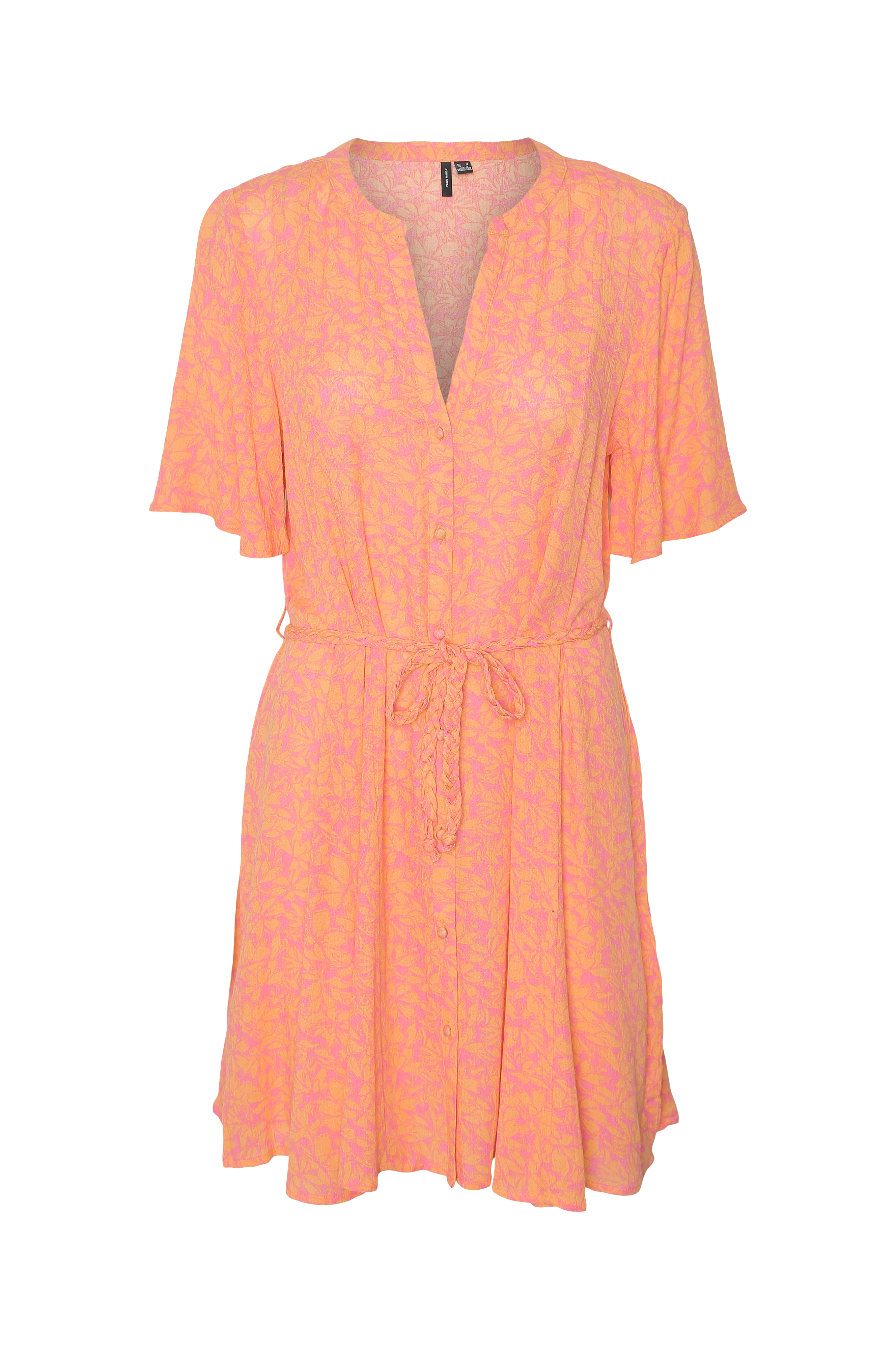 • Model med svaj i crepe• Halsudskæring med v-udskæring foran• Beklædte knapper hele vejen frem• Kort ærme med svaj• Flettet bindebælte ved taljen• Længde: 87 cm i størrelse S