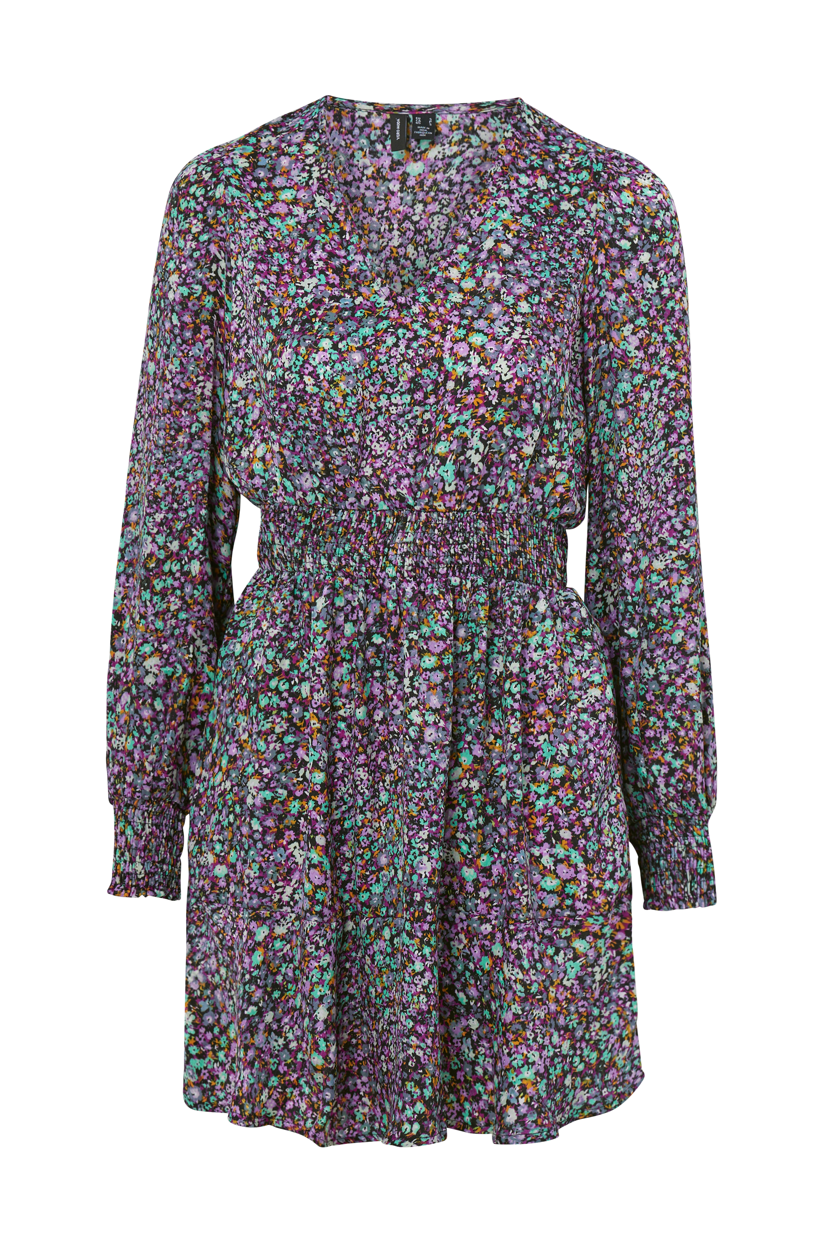 Kort kjole med V-udskæring foran og markeret talje med smock. Langt, vidt ærme med smock i ærmekanten. A-formet nederdel med flæse. Længde ca. 86 cm i str. S.