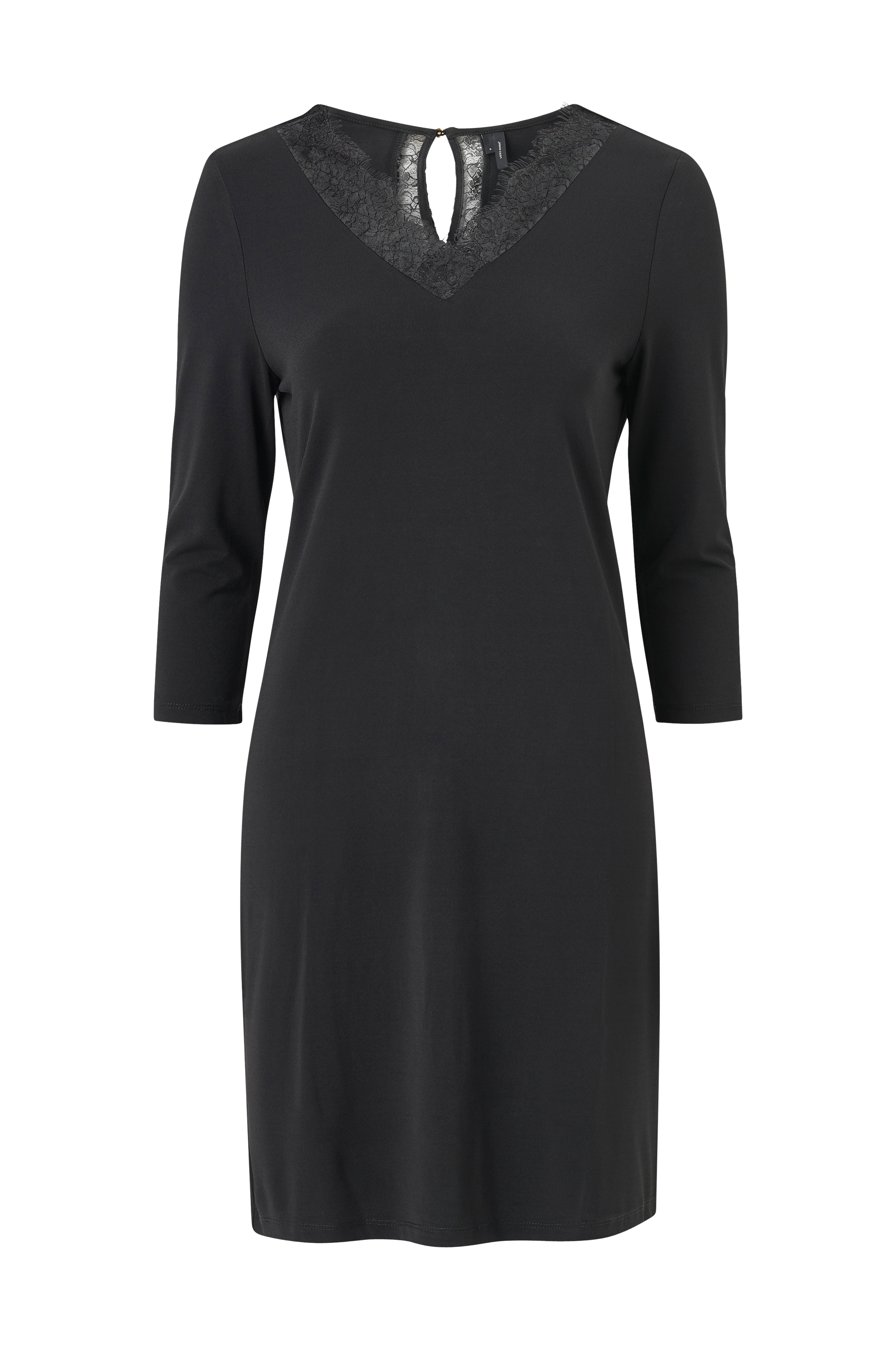 Kjole vmMilla Lace 3/4 Short Dress fra Vero Moda. Let figursyet model med V-udskæring som har bred, gennembrudt blonde i kanten. Smalt kantbånd i nakken samt slids med blondekant og guldfarvede knapper. Lige, 3/4-langt ærme. Fin jerseykvalitet med stretch. Længde ca. 92 cm i str. S.