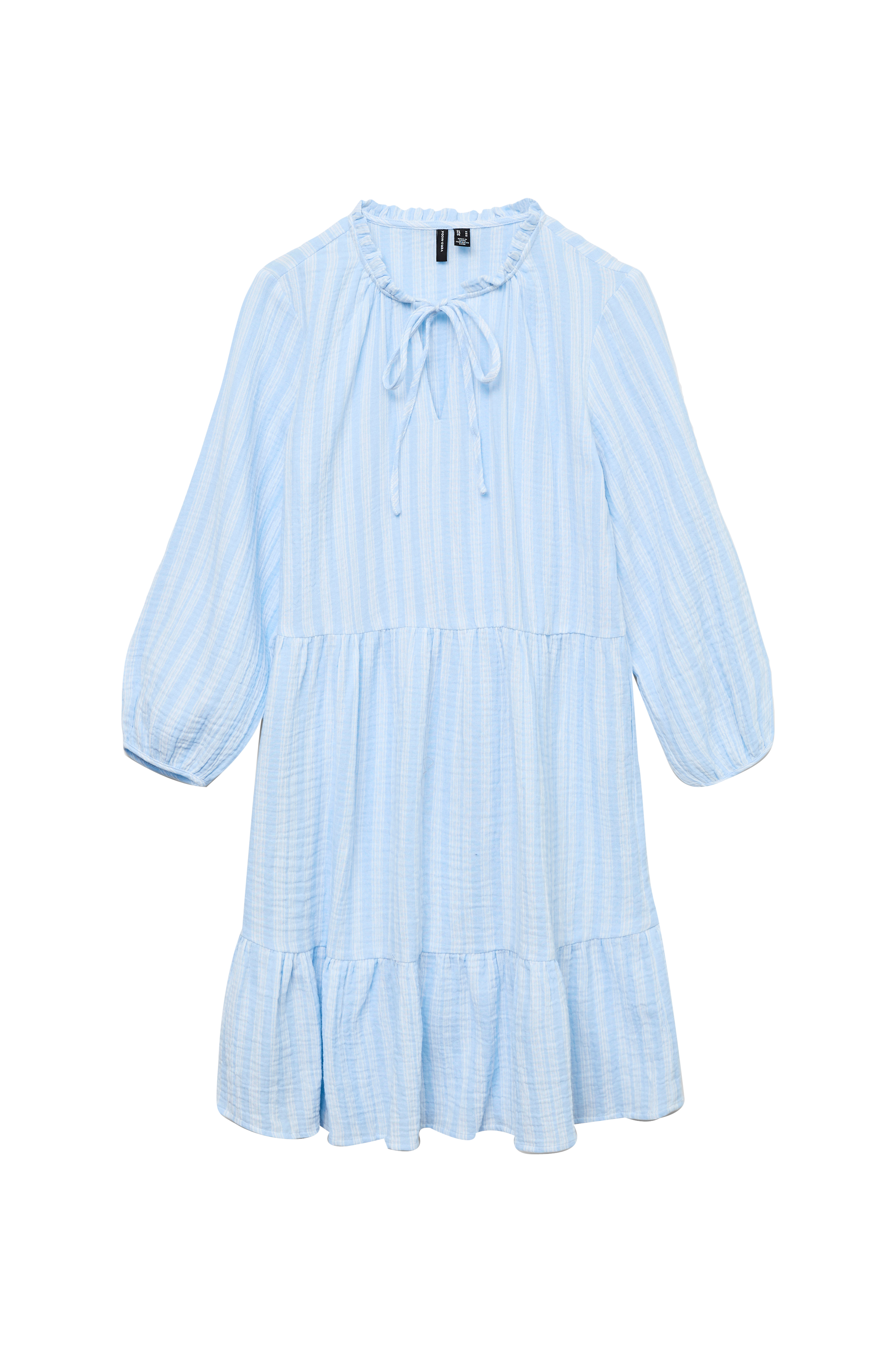 • Kjole i blød bomuld med løs pasform• Rund halsudskæring med slids og bindbart bånd foran• Volant rundt om halsen og nederst på kjolen• 3/4 lange ærmer• Længde: 89 cm i størrelse XS