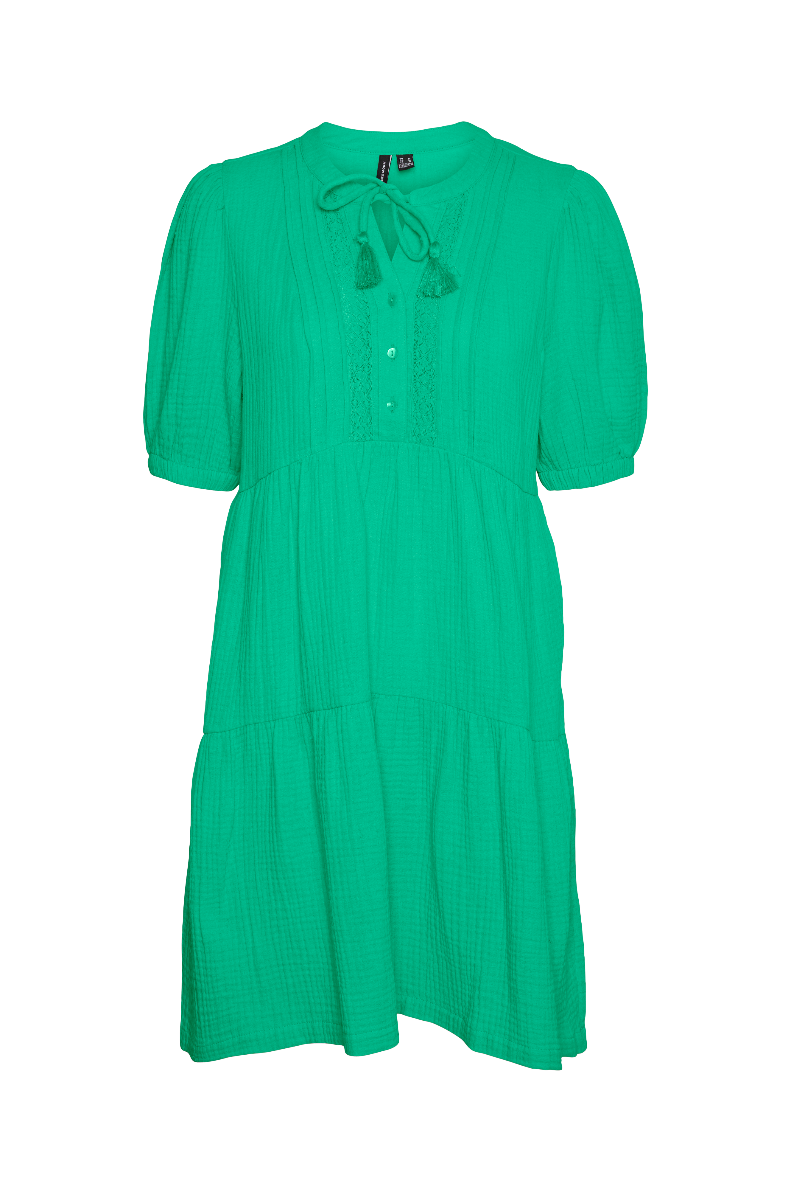• Model med svaj i bomuldsblanding med struktur• Bindebånd med kvaster i halsen• Biselæg oppe foran• Korte ærmer med elastiske manchetter• Længde: 86 cm i størrelse S