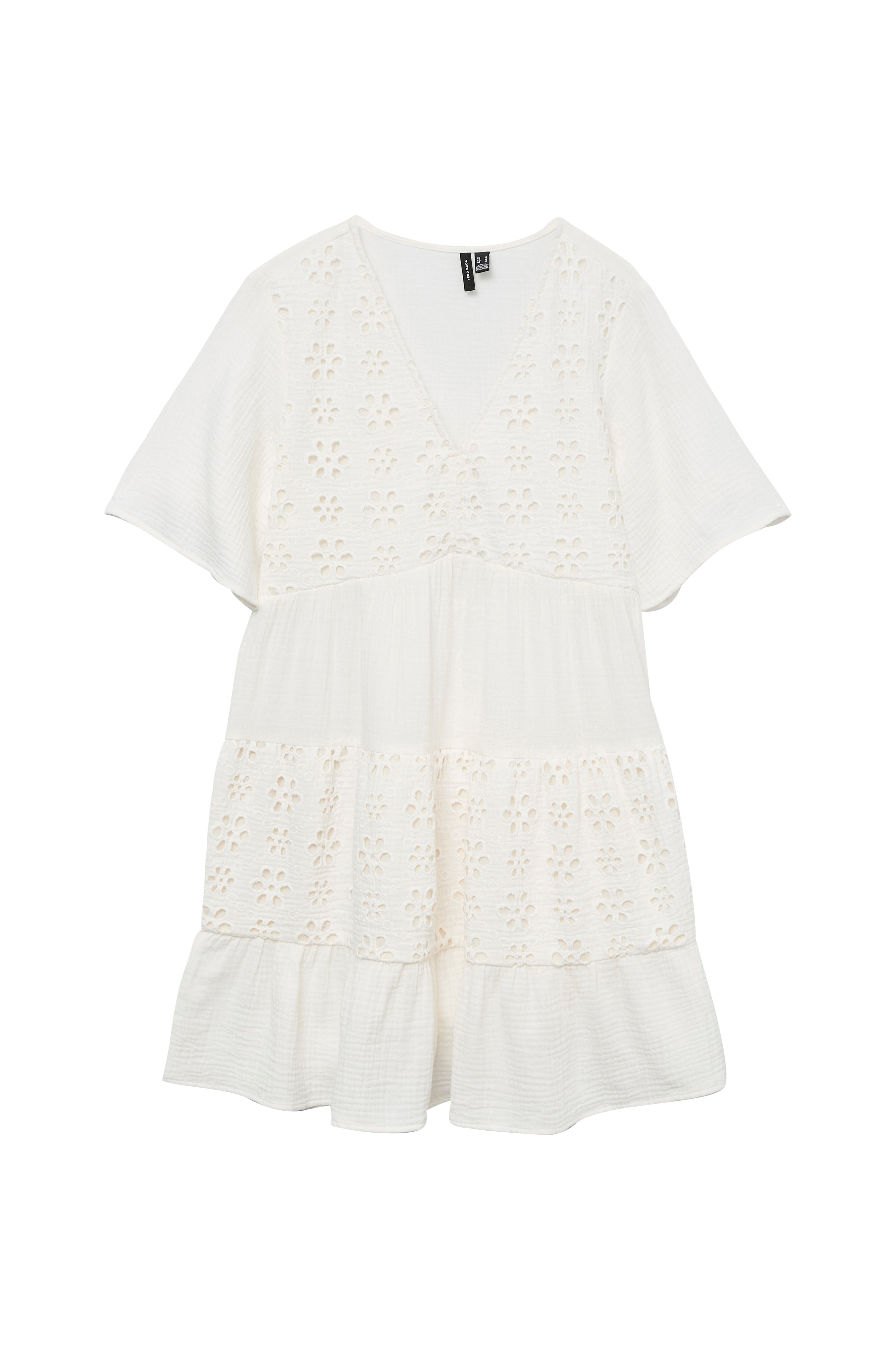 • Mønstervævet model• Hulbroderier på brystet og på skørtet• V-formet halsudskæring• Kort ærme med svaj• Rynket talje• Længde: 84 cm i størrelse XS