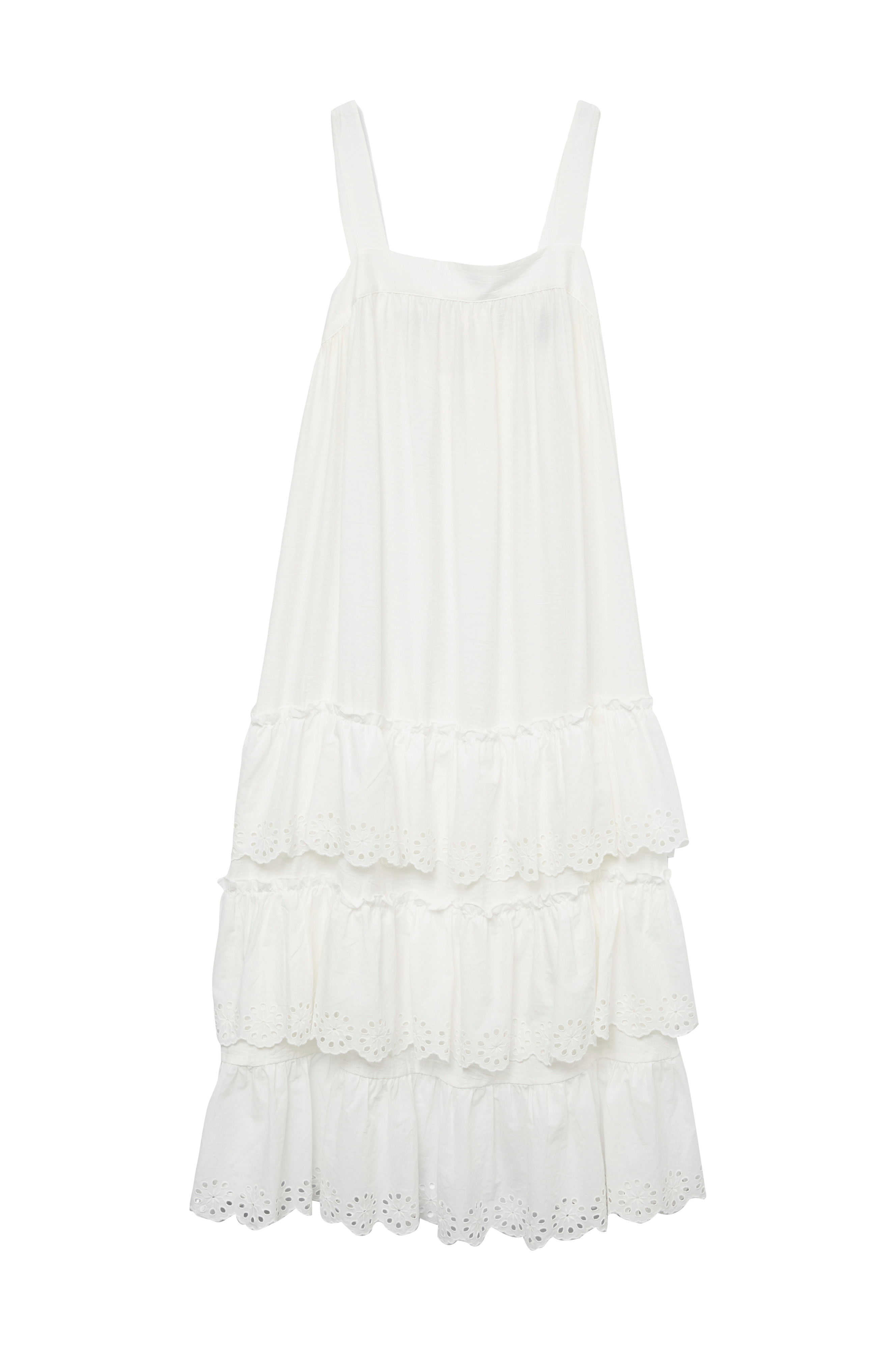 • Ærmeløs, foret kjole i viskoseblanding• Figursyet pasform• Bindebånd i ryggen• Volanter med hulbroderier på skørtet• Længde: 123 cm i størrelse S
