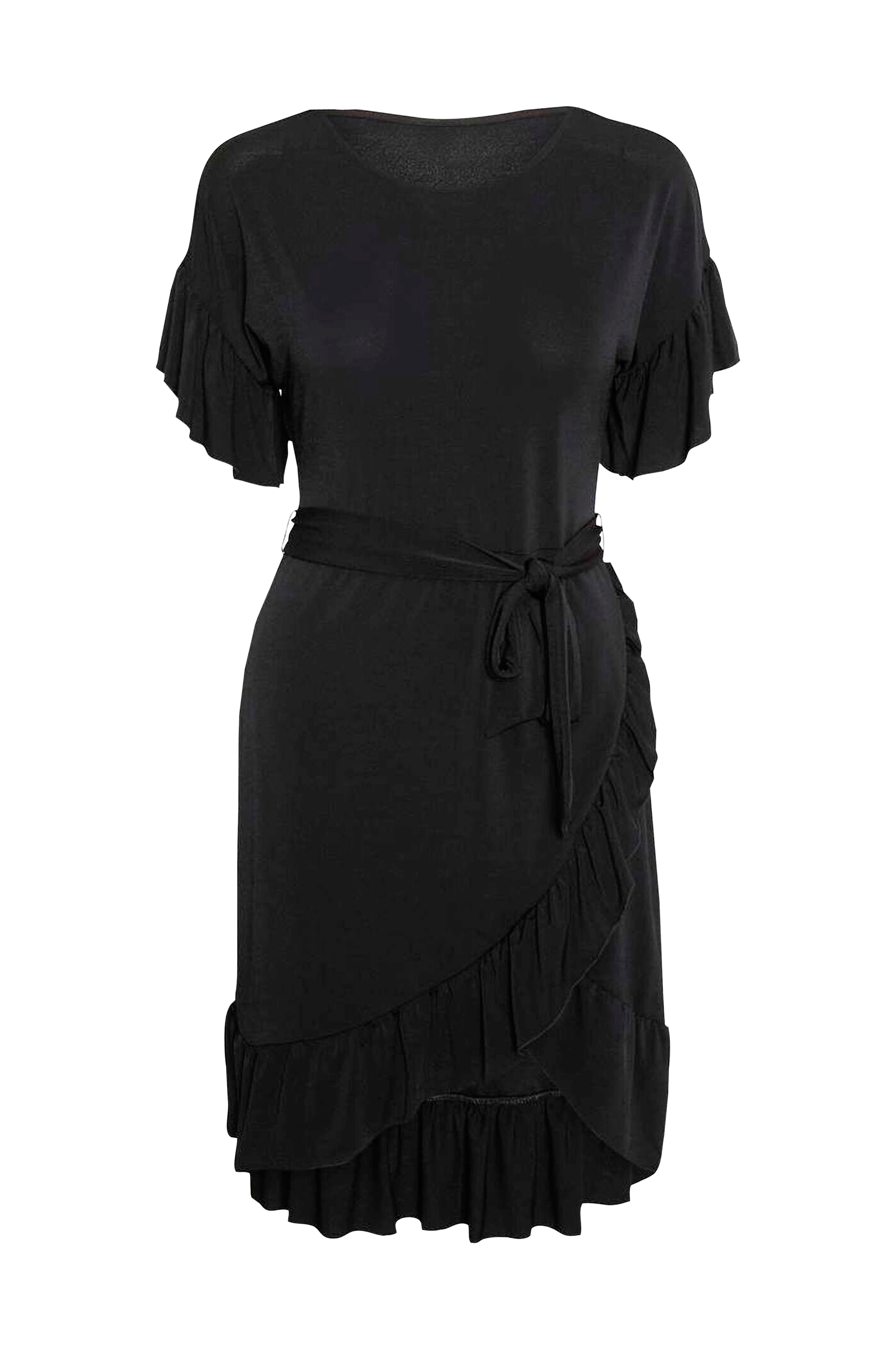 Kjole vmPoppy S/S Tie Short Dress fra Vero Moda. Figursyet model i fin jerseykvalitet med lav skulder og kort flæseærme. Rund hals med smal søm og afskæring i taljen med bindebælte. Slå om-nederdel med påsyet flæse foran og i kanten forneden. Længde bagpå ca. 99 cm i str. S.