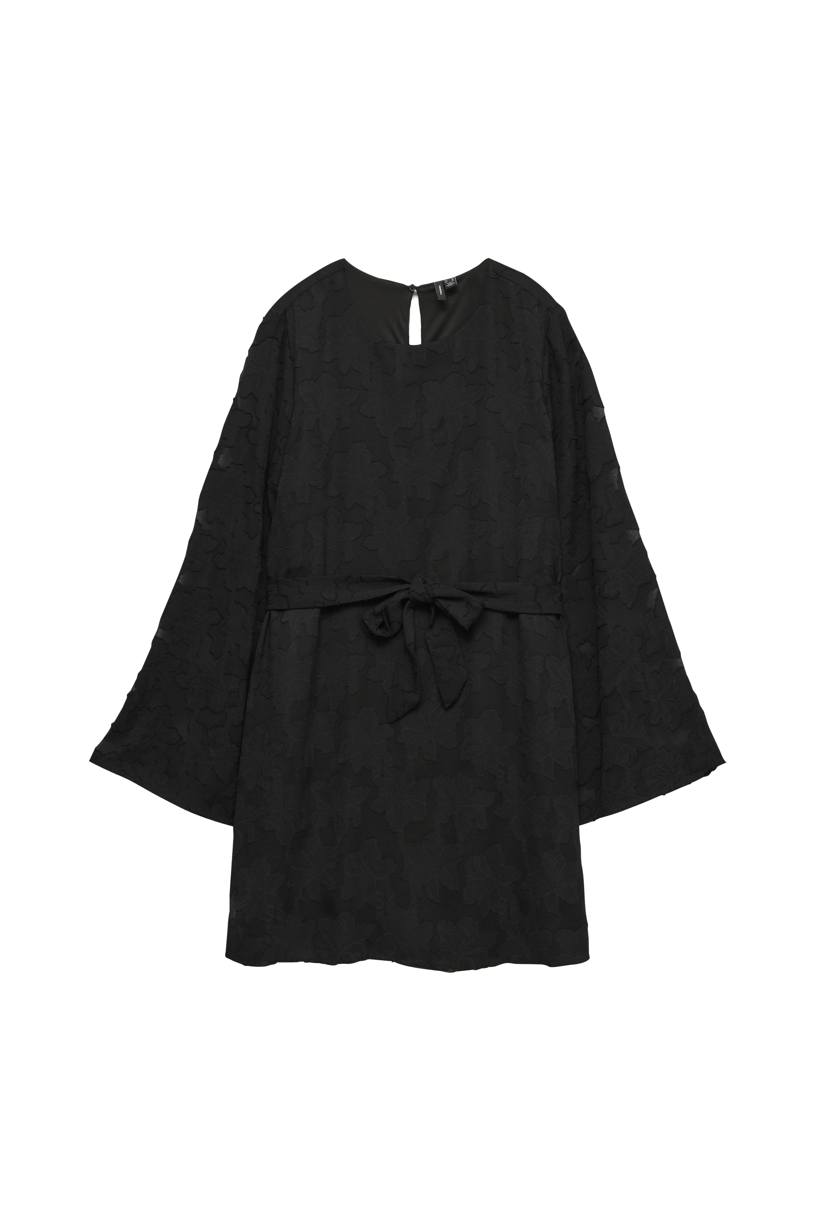 • Kjole med dekorative applikationer• Rund halsudskæring• Slids med knap bagpå• Lange, semitransparente ærmer• Bindebånd ved taljen• Tekstilforing• Længde: 90 cm i størrelse S