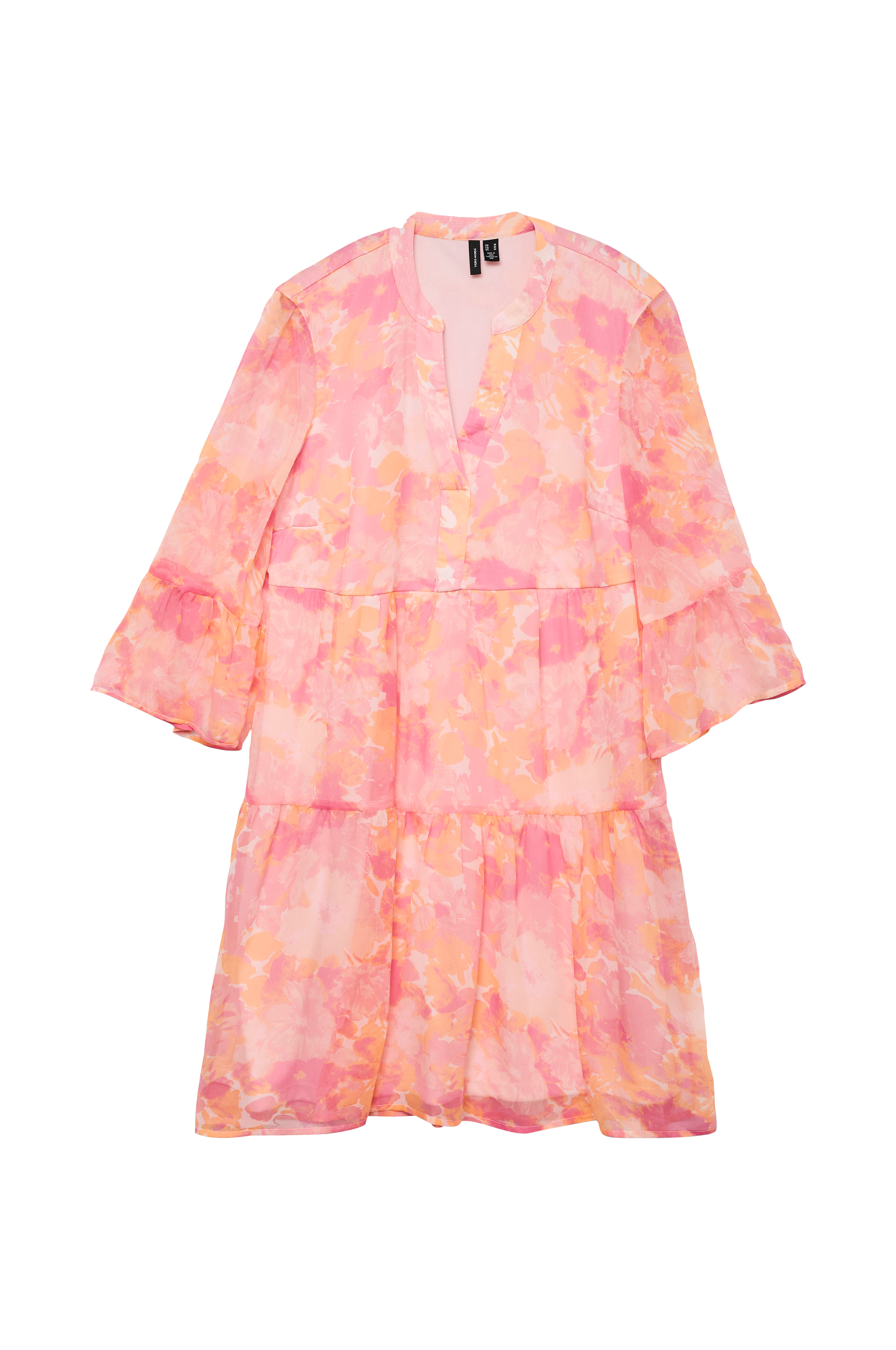 • Model med svaj i chiffon crepe• Rund hals med ventilation foran• 3/4 langt ærme med volant ved manchetterne• Rynket talje• Foret• Længde: 90 cm i størrelse XS