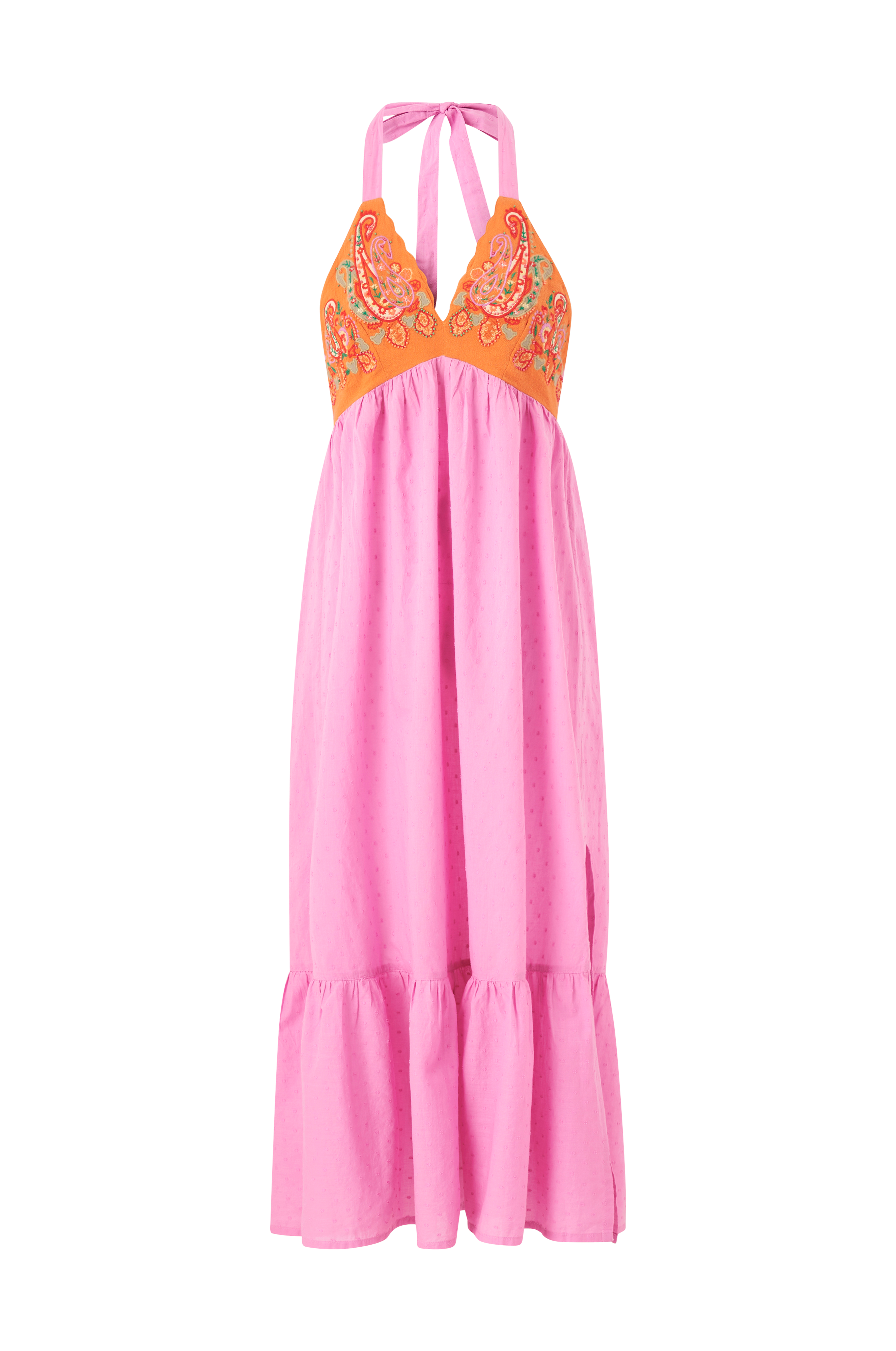 • Ankellang kjole• Halterneckdesign• Broderier over brystet• Volant nederst• Slidser i siderne• Smock i ryggen• Længde: 128 cm i størrelse S