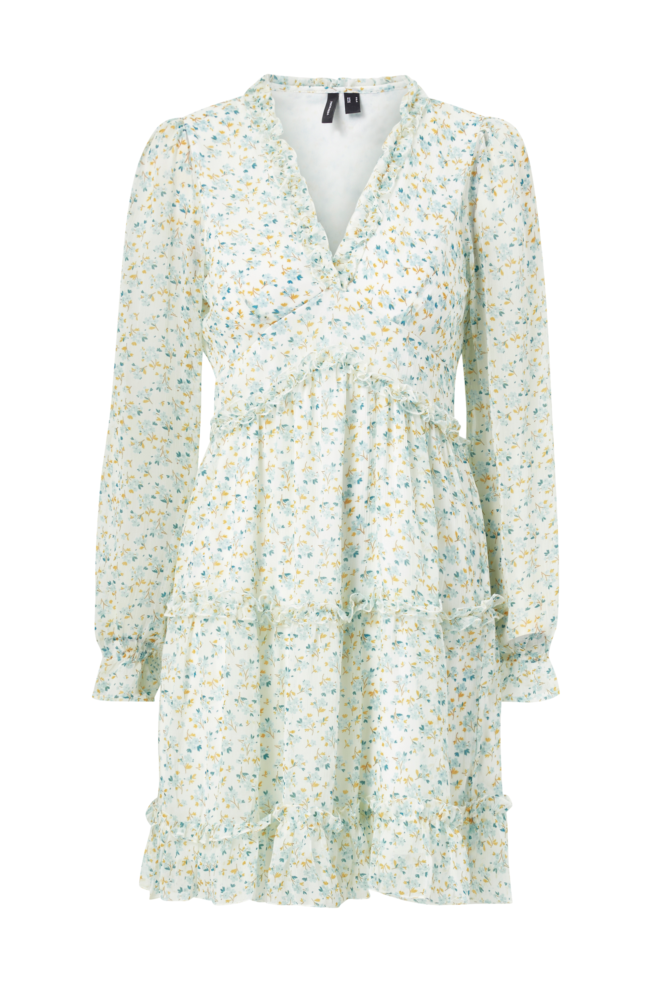 • V-hals • Langt ærme med volant • Volanter på skørtet • Fremstillet af tynd chiffon • Foret • Længde: 88 cm i størrelse S • Produktet indeholder genindvundet materiale, som genbruges for at reducere mængden af affald samtidigt med at der ikke anvendes nye ressourcer.