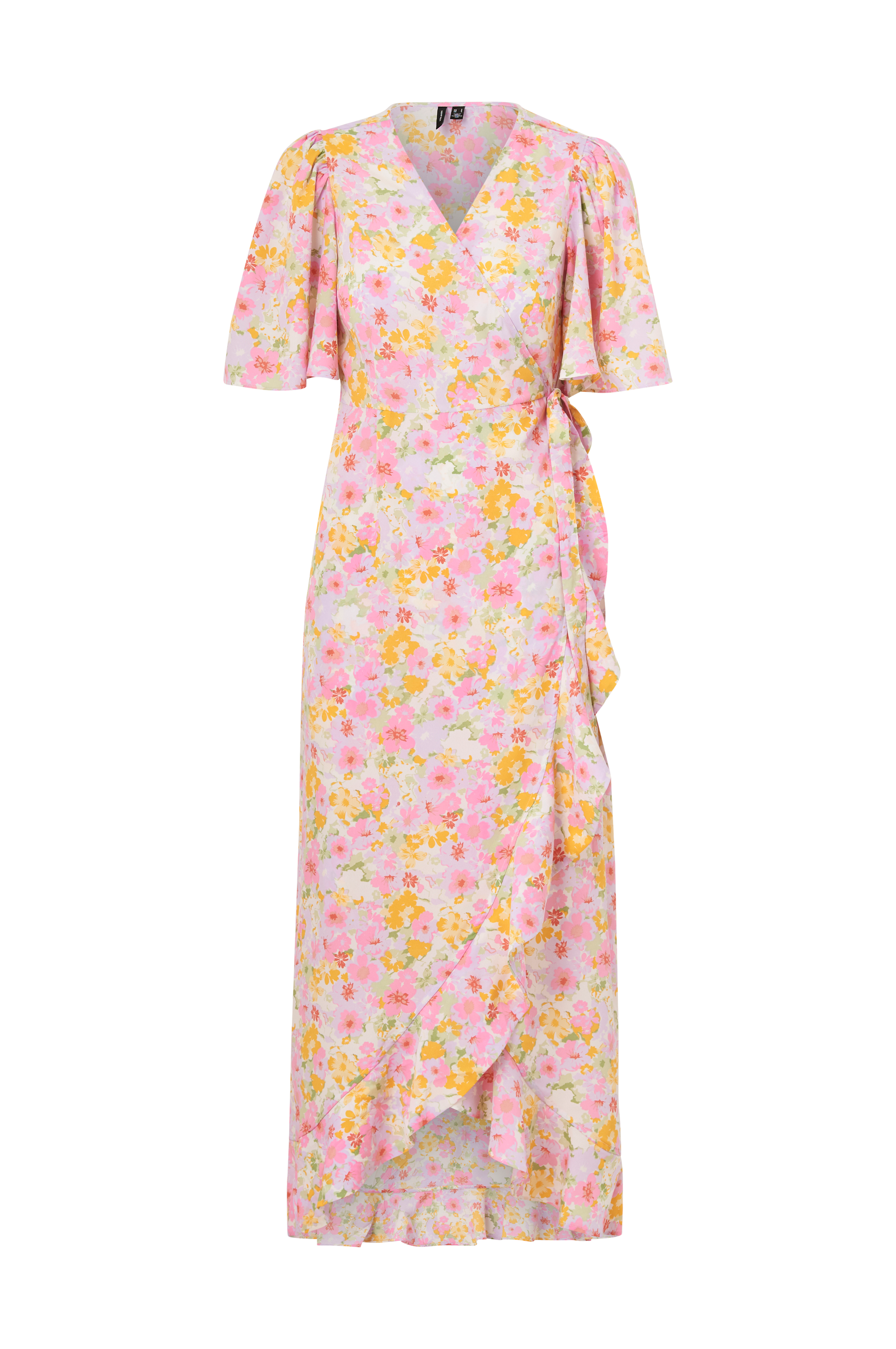 • Lang slå-om kjole • Snøring i siden • Korte sommerfugleærmer • Volant på skørtet • Længde: 135 cm i størrelse S • Produktet indeholder genindvundet materiale, som genbruges for at reducere mængden af affald samtidigt med at der ikke anvendes nye ressourcer.