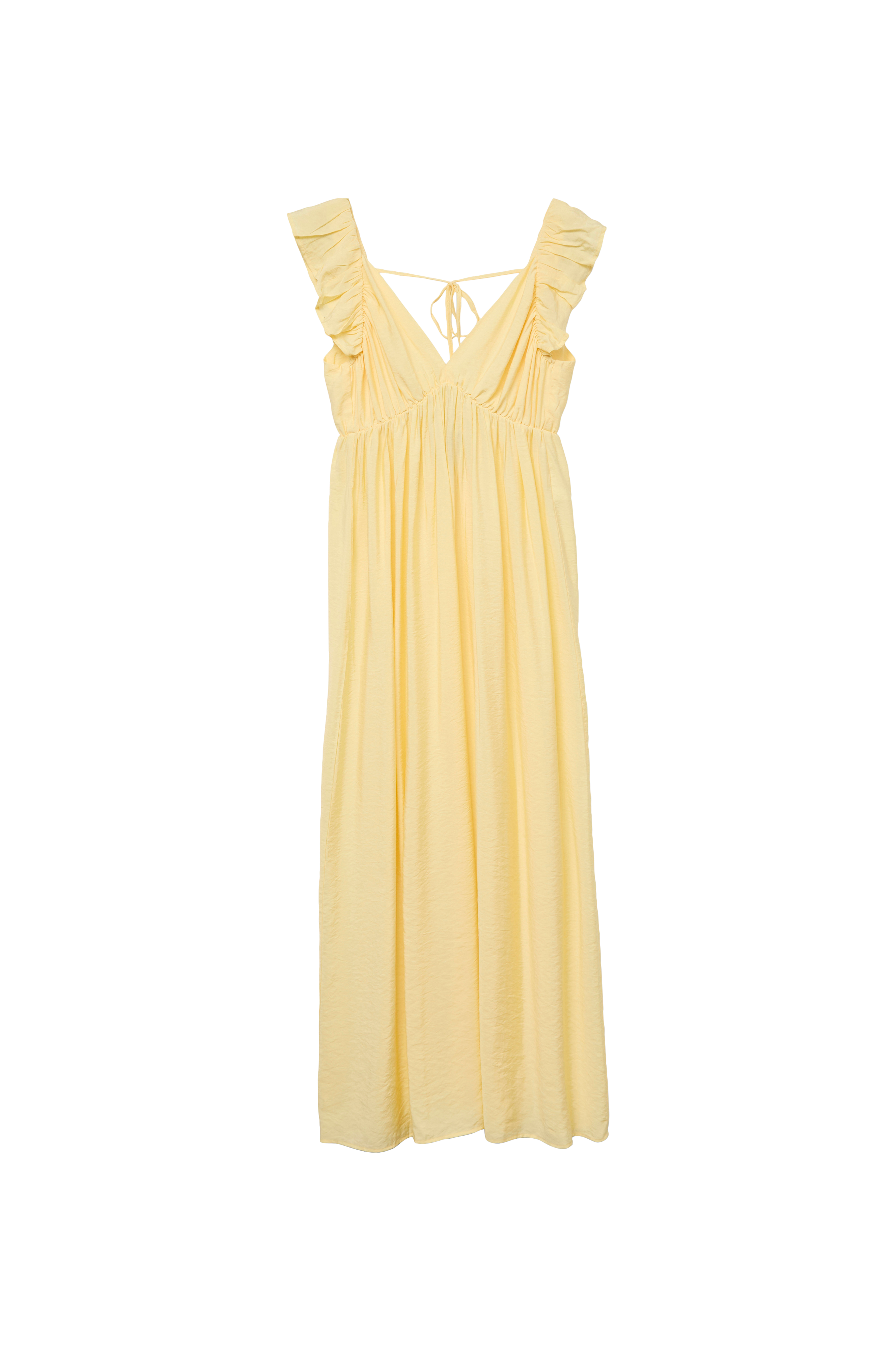 • Lang model • Volant over skuldrene • V-udskæring med dyb udskæring i ryggen og tynde bindebånd i nakken • Elastisk talje • Længde: 129 cm i størrelse XS