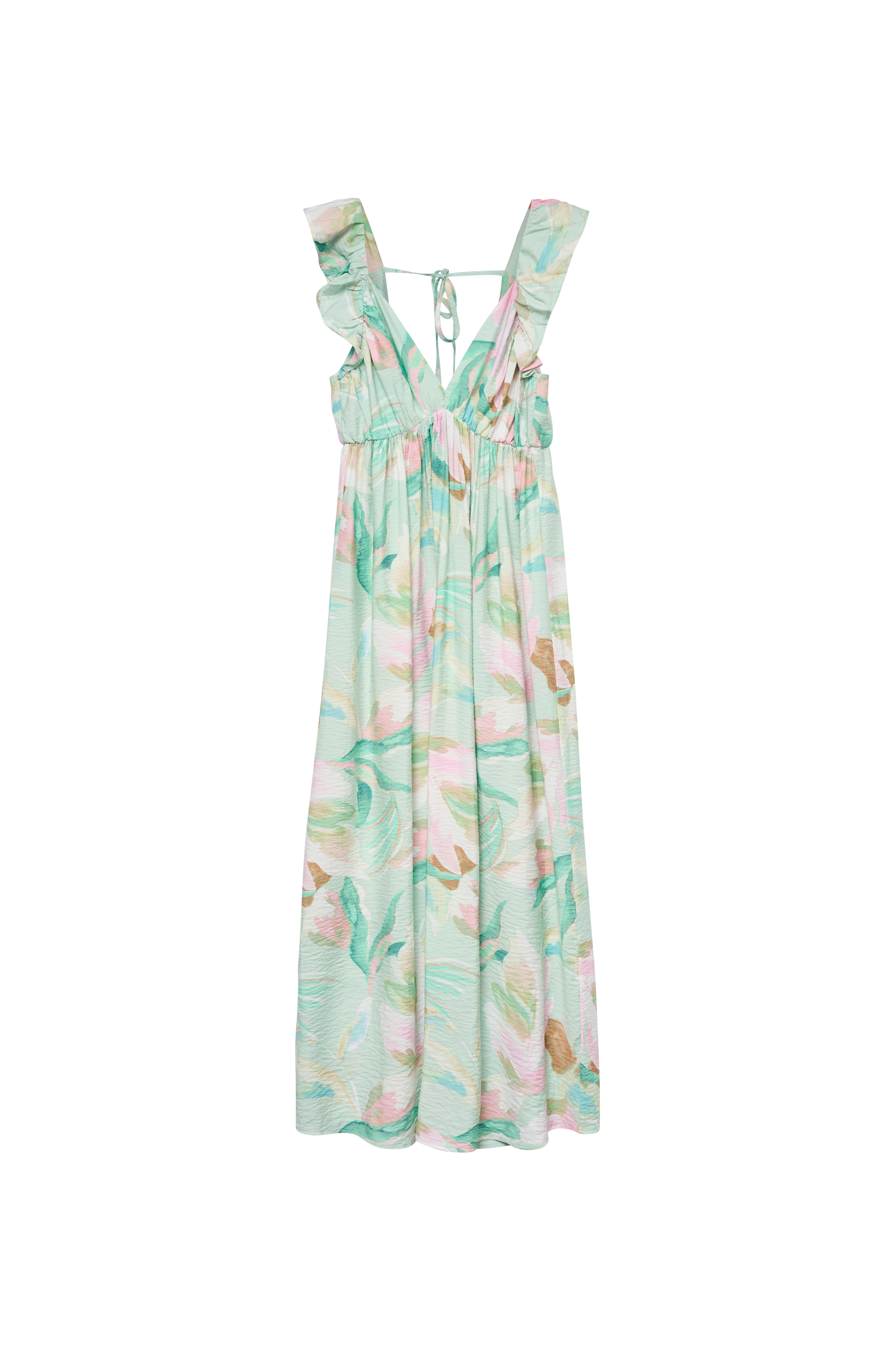 • Lang model • Volant over skuldrene • V-udskæring med dyb udskæring i ryggen og tynde bindebånd i nakken • Elastisk talje • Længde: 129 cm i størrelse XS