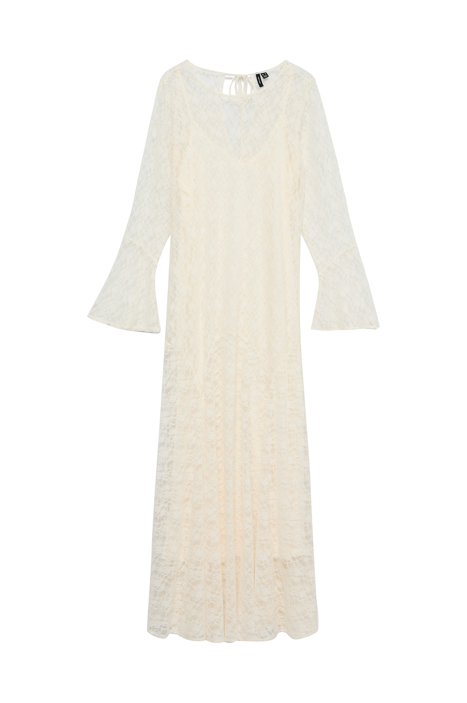 • Lang kjole i elastisk blonde• Åbning med bindebånd i ryggen• Lange trompetærmer• Nedre del med svaj• Underkjole i jersey• Længde: 138 cm i størrelse S