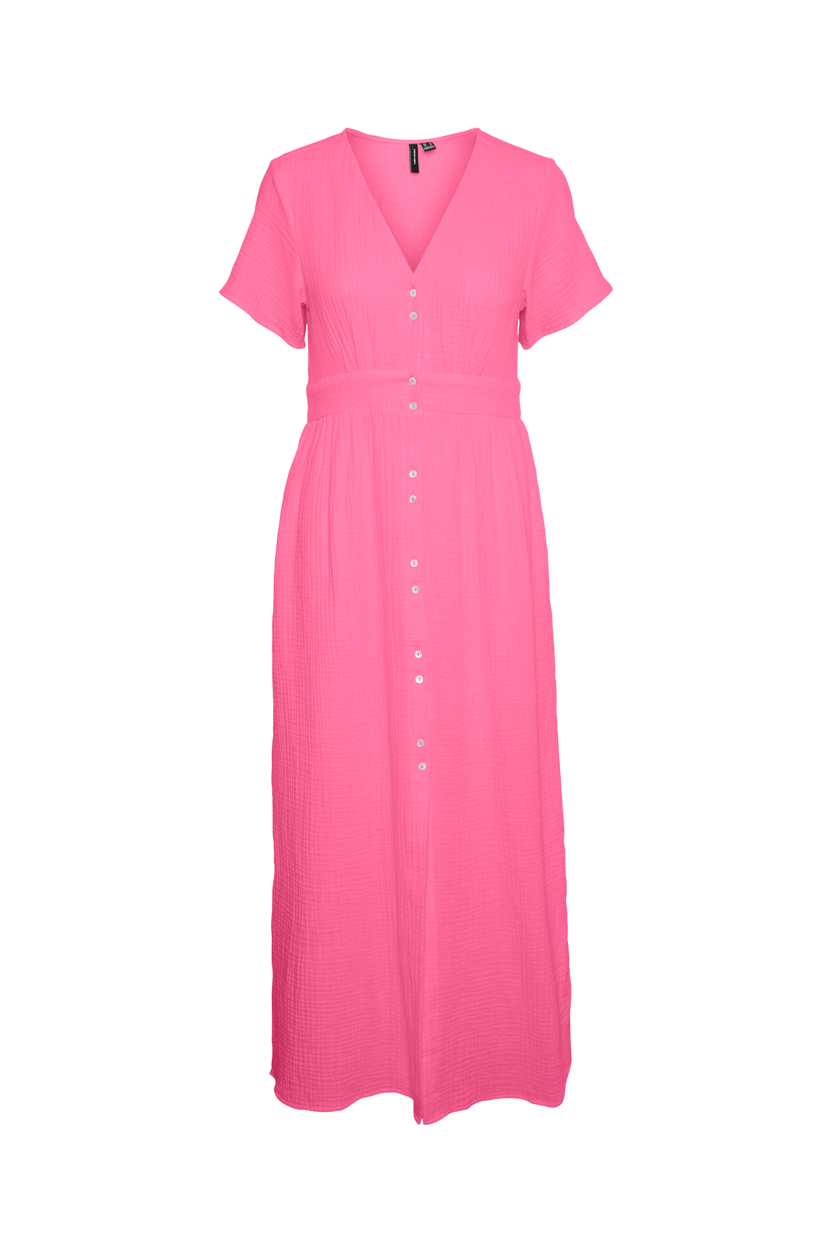 • Lang kjole i bomuldsblanding med struktur• V-udskæring• Knapper foran• Korte ærmer• Længde: 131 cm i størrelse S