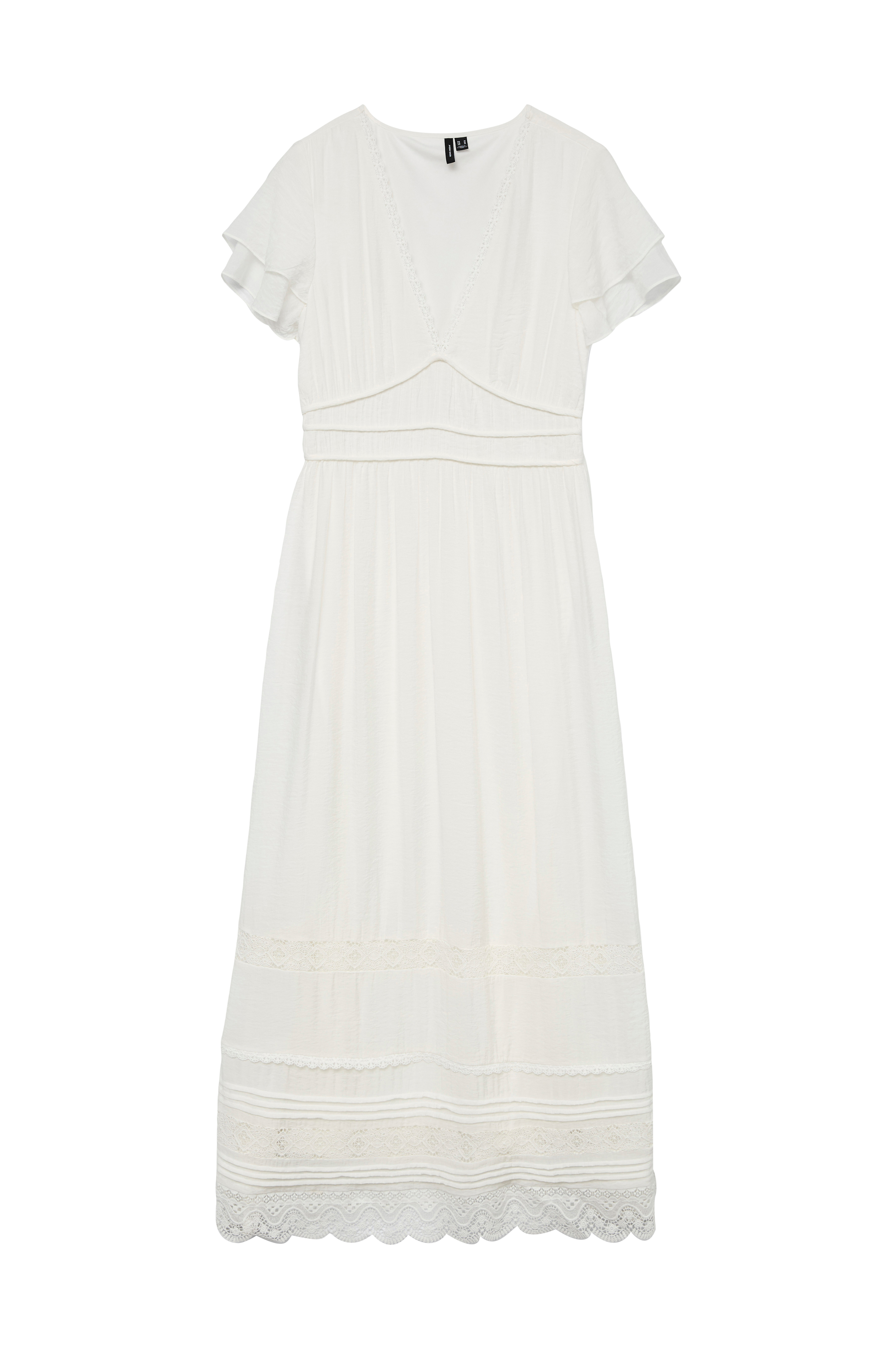 • Lang, foret med tekstil model• Dyb v-udskæring• Korte sommerfugleærmer• Defineret talje• Broderede detaljer langs udskæringen og nederst• Normal pasform• Længde: 136 cm i størrelse