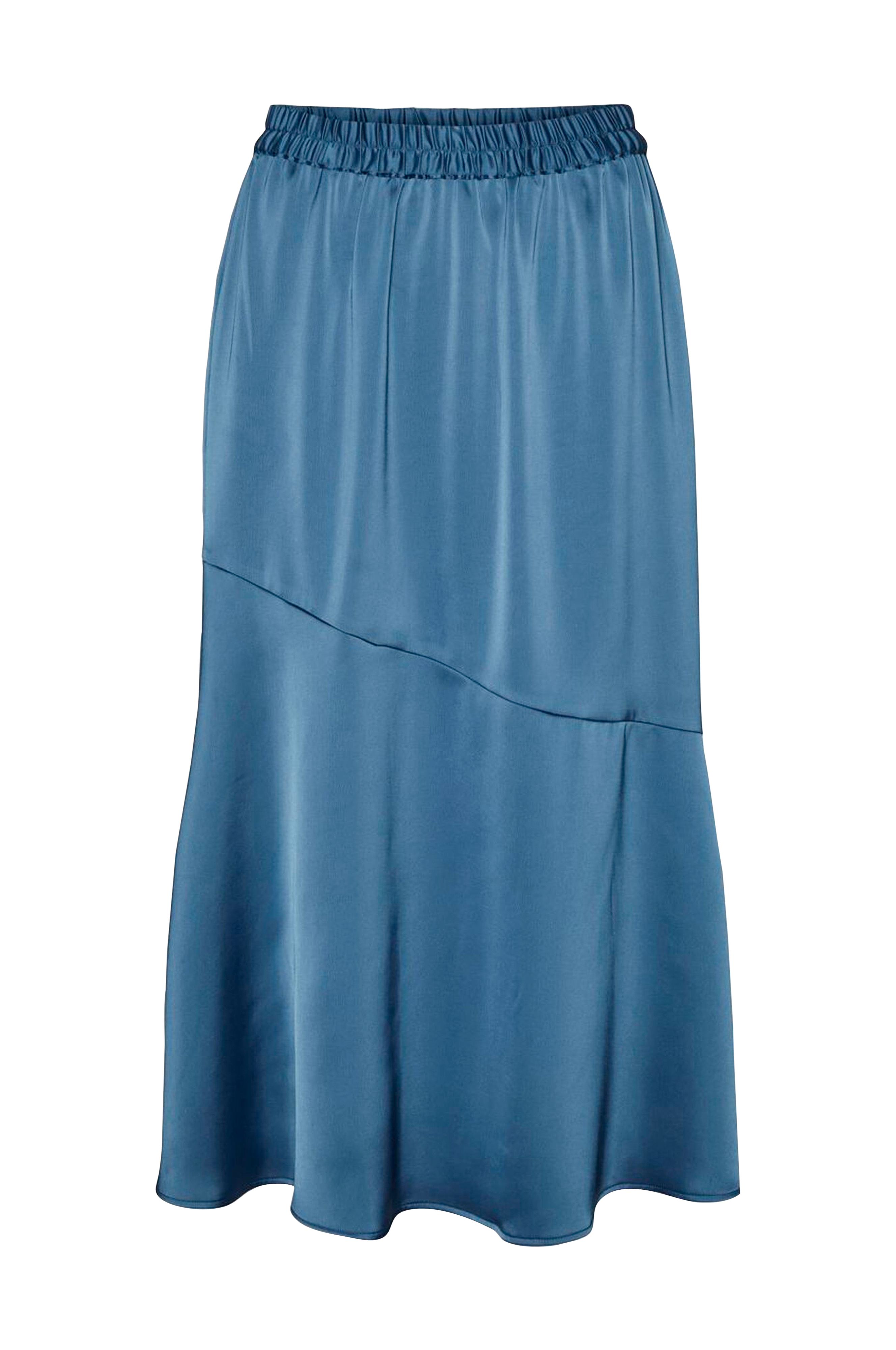 Læglang, klokkeformet nederdel med diagonal søm og bred elastik i taljen. I vævet kvalitet med glans. Længde ca. 80 cm i str. S.