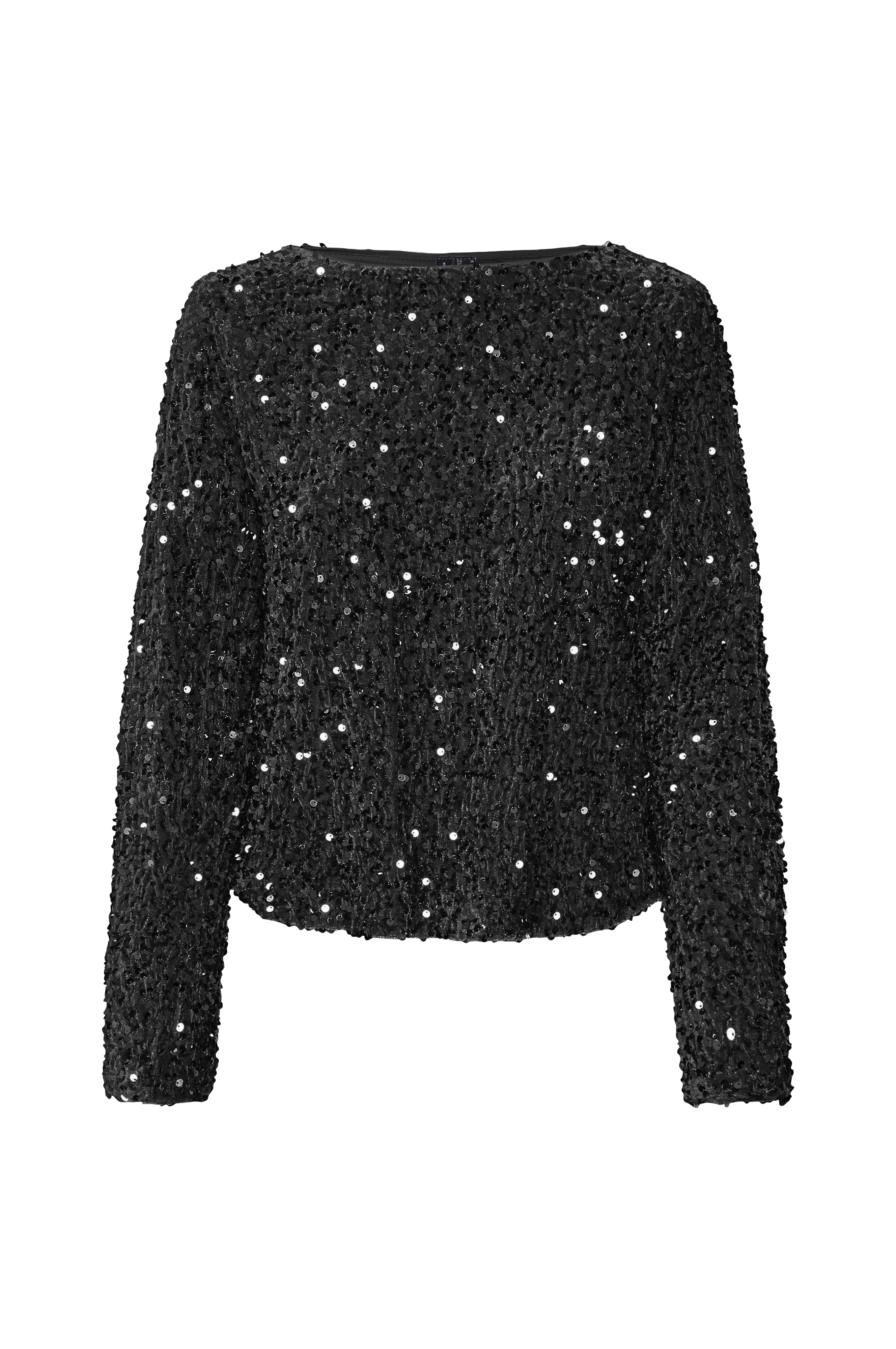 • Top med skinnende pailletter• Rund, bred halsudskæring• Langt ærme• Elastisk for