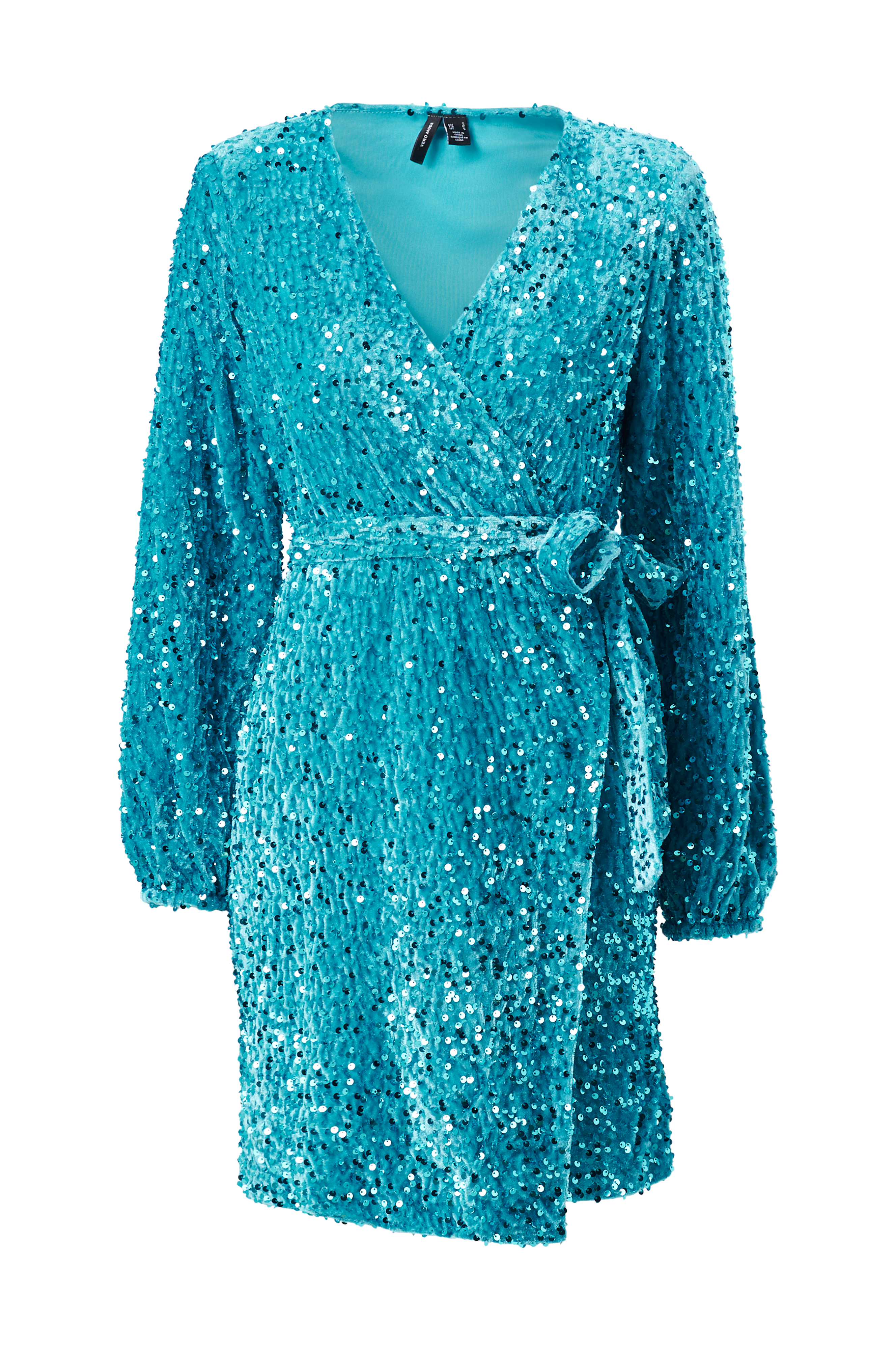• Kort festkjole i blød fløjl med pailleter• Slå-om design med fast, elastisk talje med bindebælte• Ballonærmer med elastiske manchetter• Trikotfor• Skjulte skulderpuder• Længde: 87 cm i størrelse S