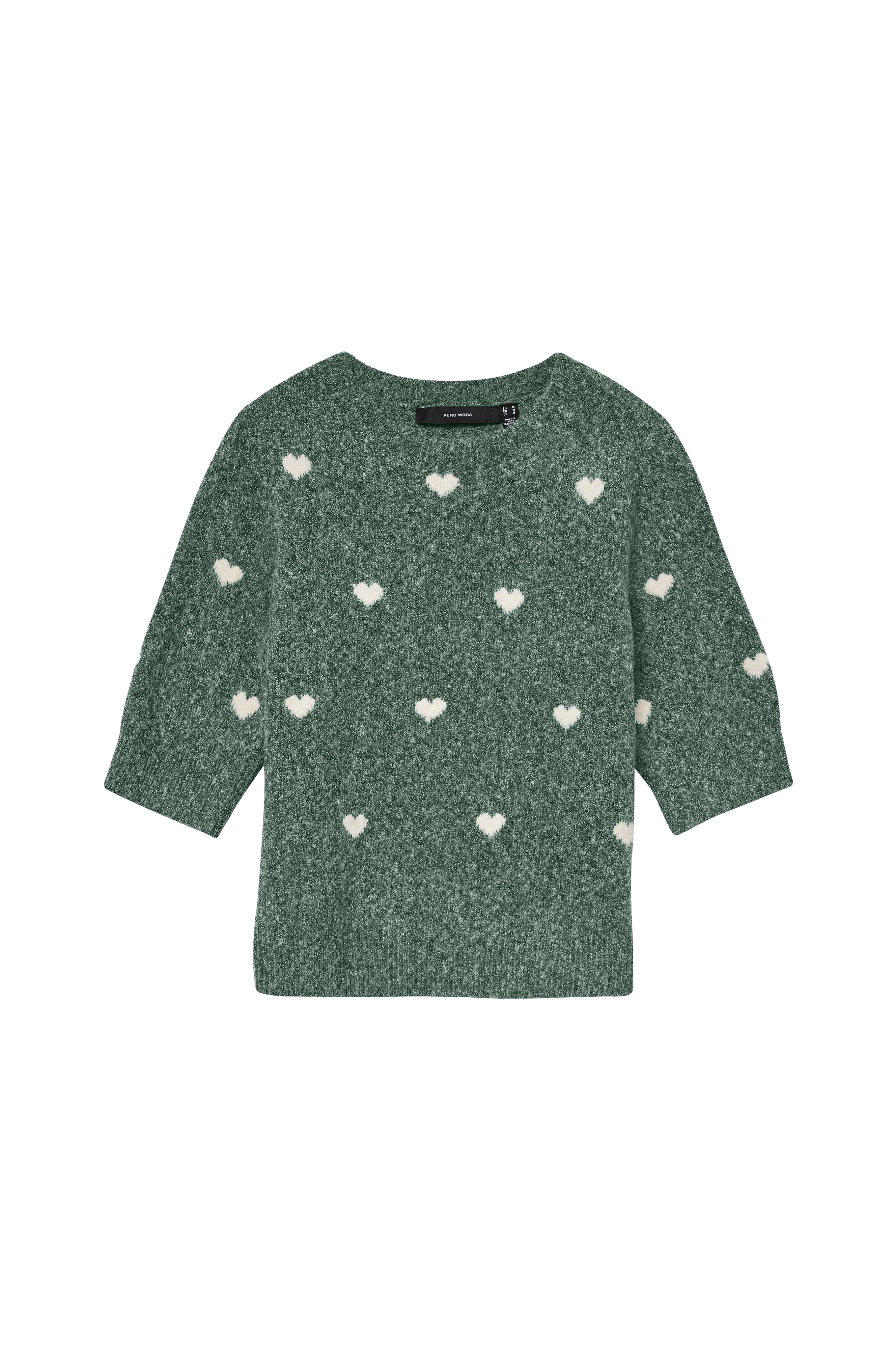 • Fintstrikket trøje med halvlange ærmer og hjerter hele vejen rundt• Rund, ribbet halsudskæring• Ribkanter ved ærmeafslutningerne og ved nederste kant