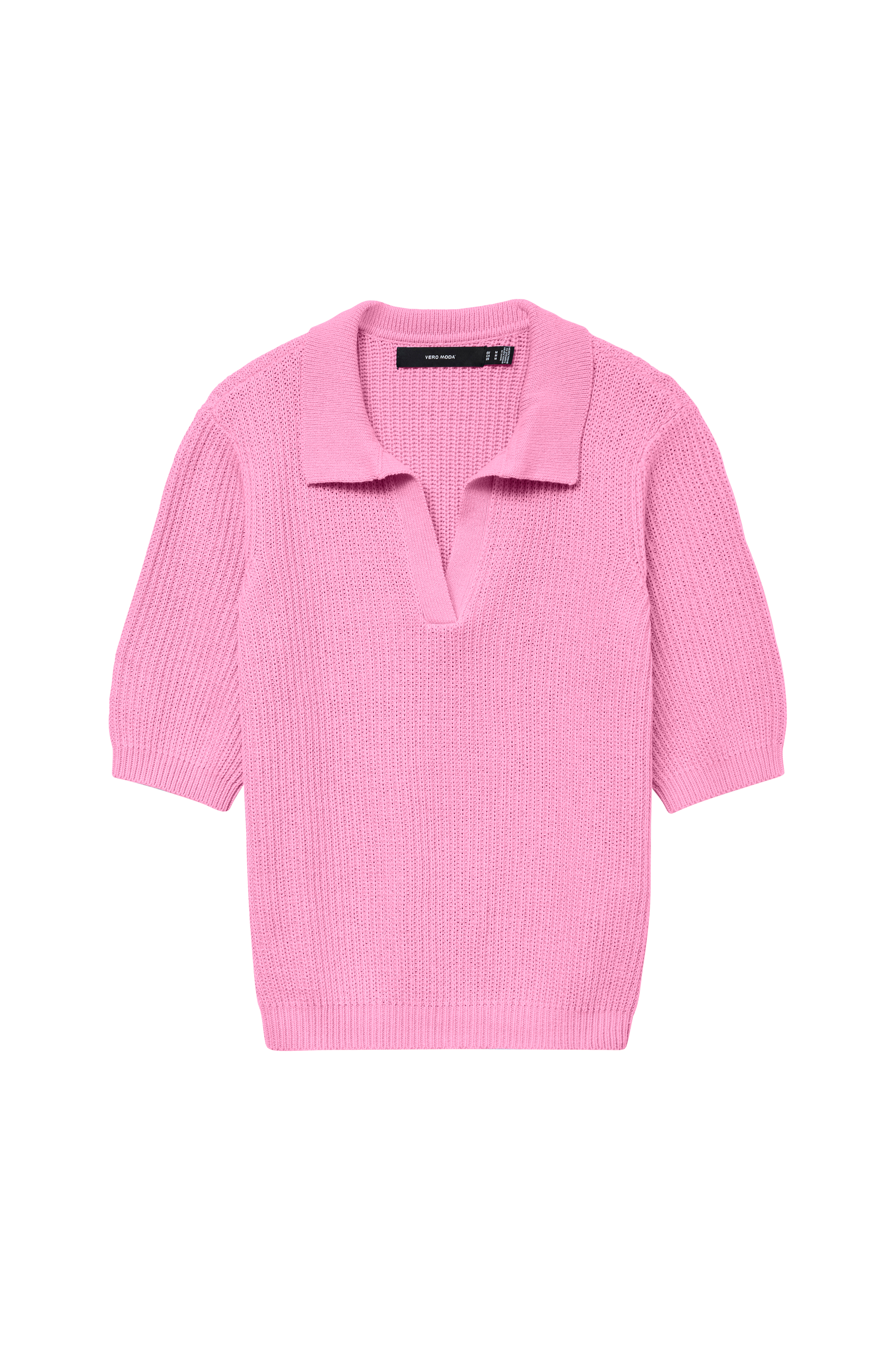 • Kortærmet, strikket trøje• Ribbet krave• V-formet halsudskæring• Ribstrik ved manchetterne og nederst