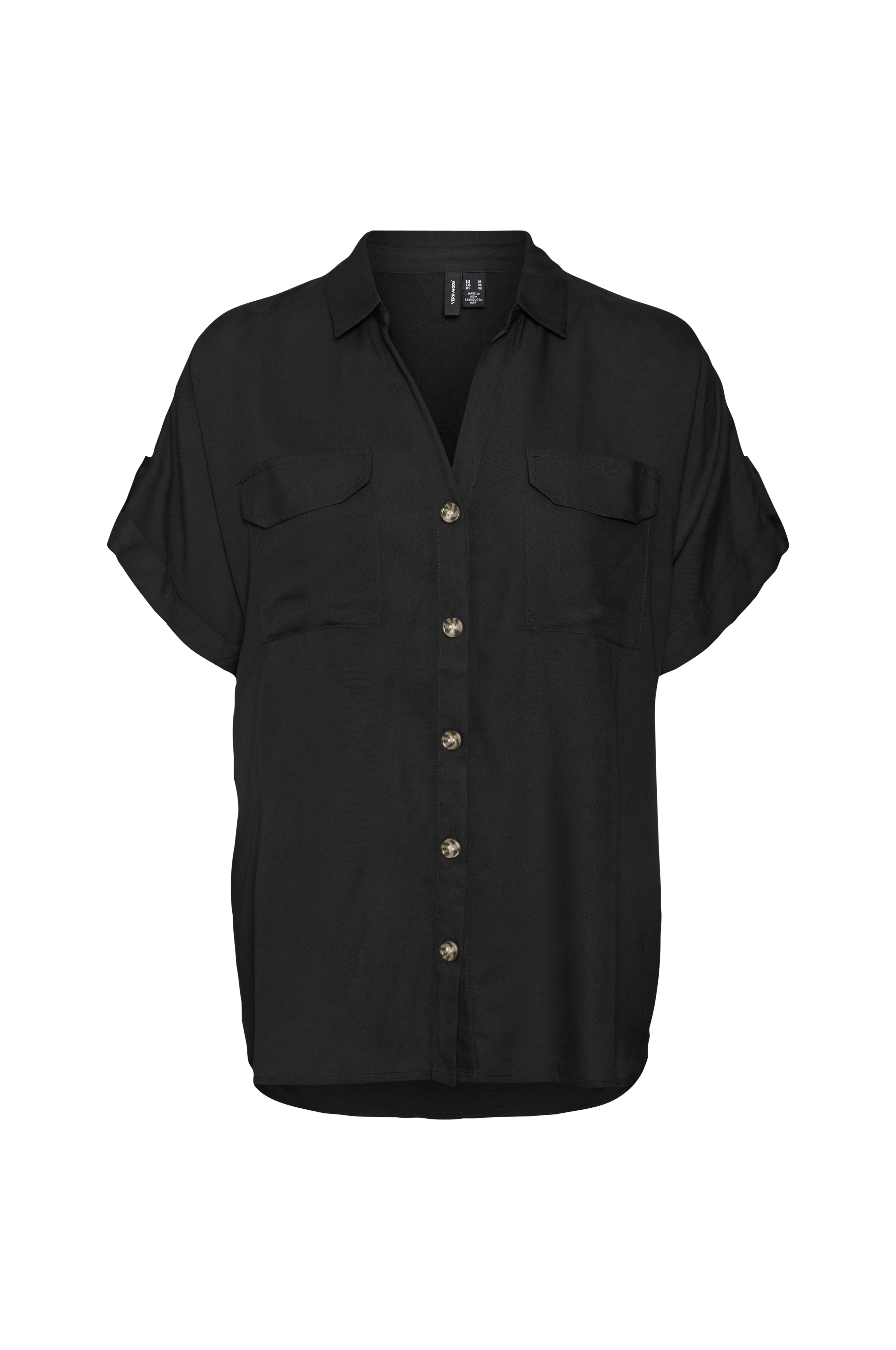 • Kortærmet skjorte i viskose• V-udskæring• Knapper foran• Syede ærmeafslutninger• Brystlommer