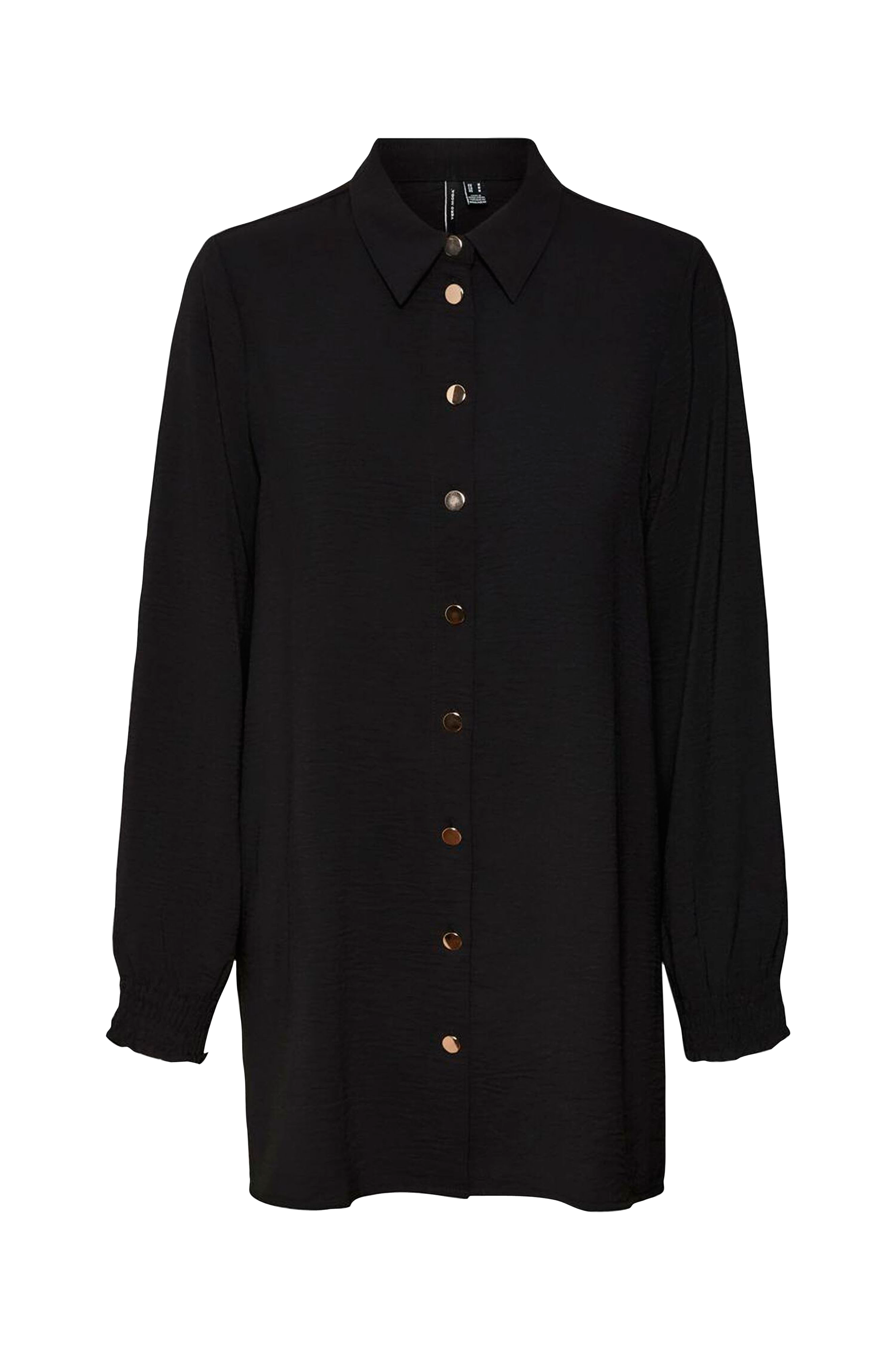 • Guldfarvede, blanke knapper foran• Lange ærmer med elastisk smock ved manchetterne• Noget længere model• Korte slidser i siderne