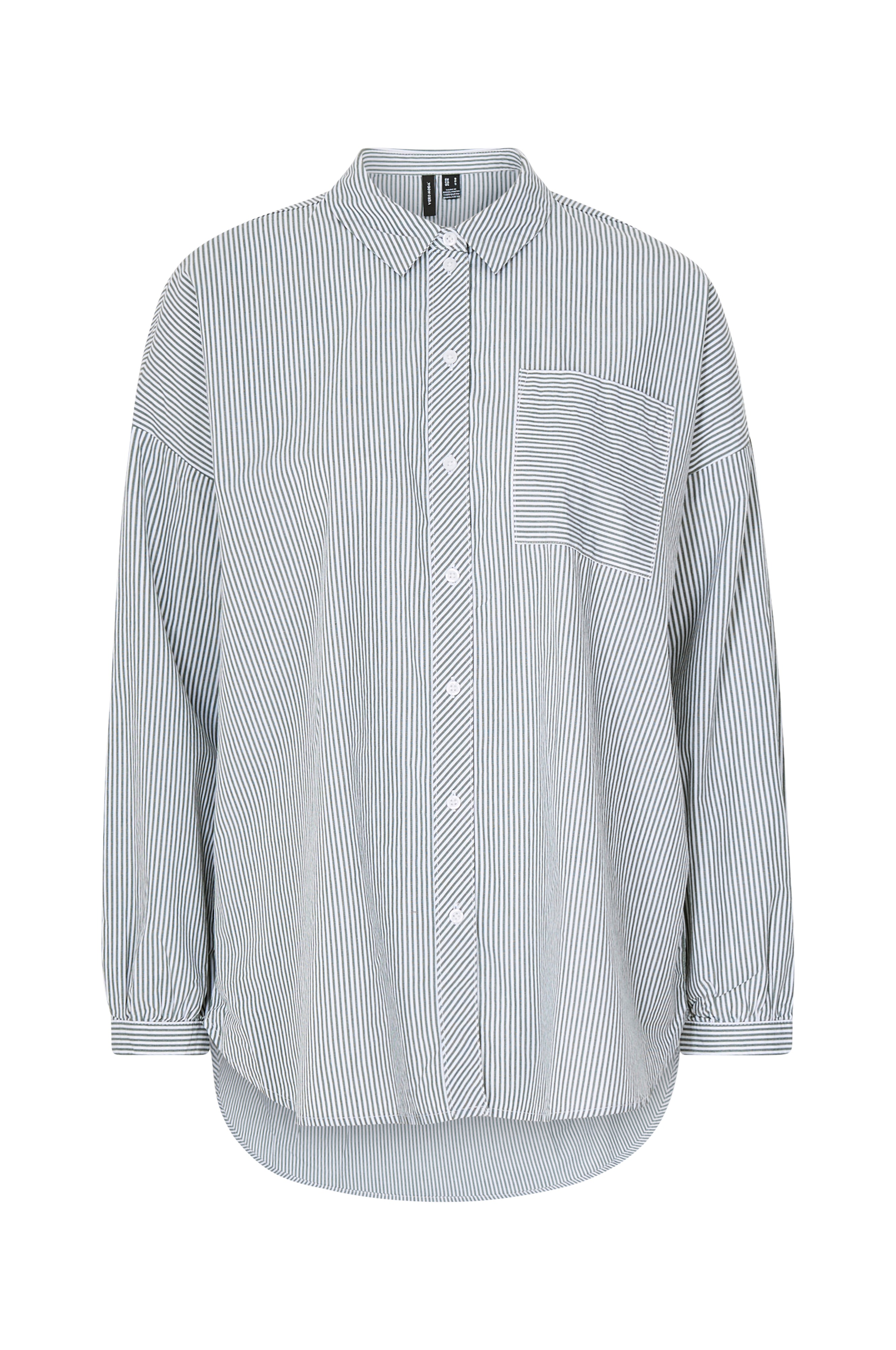 • Oversize model• Lange ærmer med manchet• Nedsænkede skuldre• En brystlomme• Afrundet søm• Længere bagpå