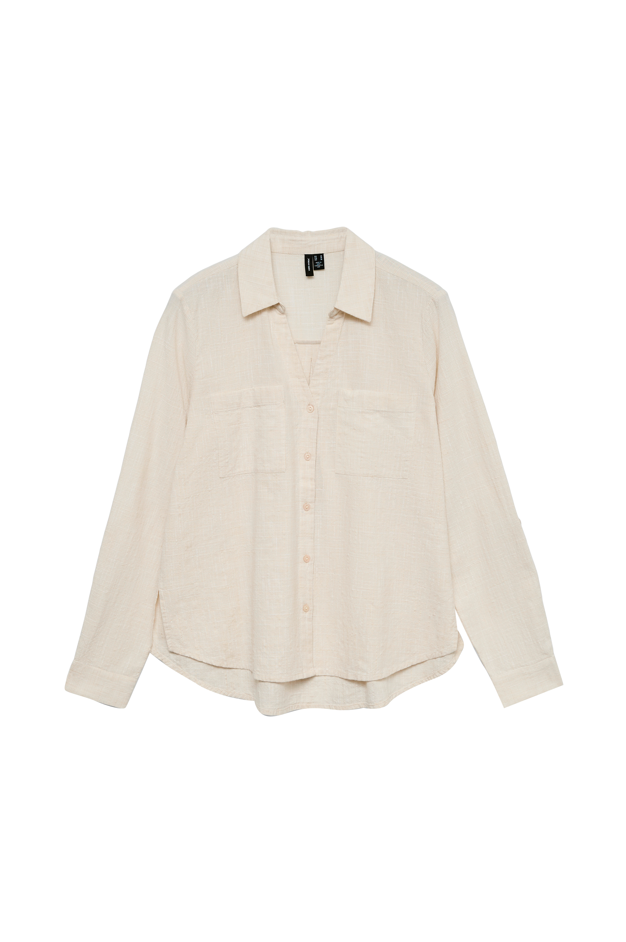 • V-formet skjorte• Opfoldende ærmer• Knaplukning• Brystlommer• Afrundet søm med slidser i siderne