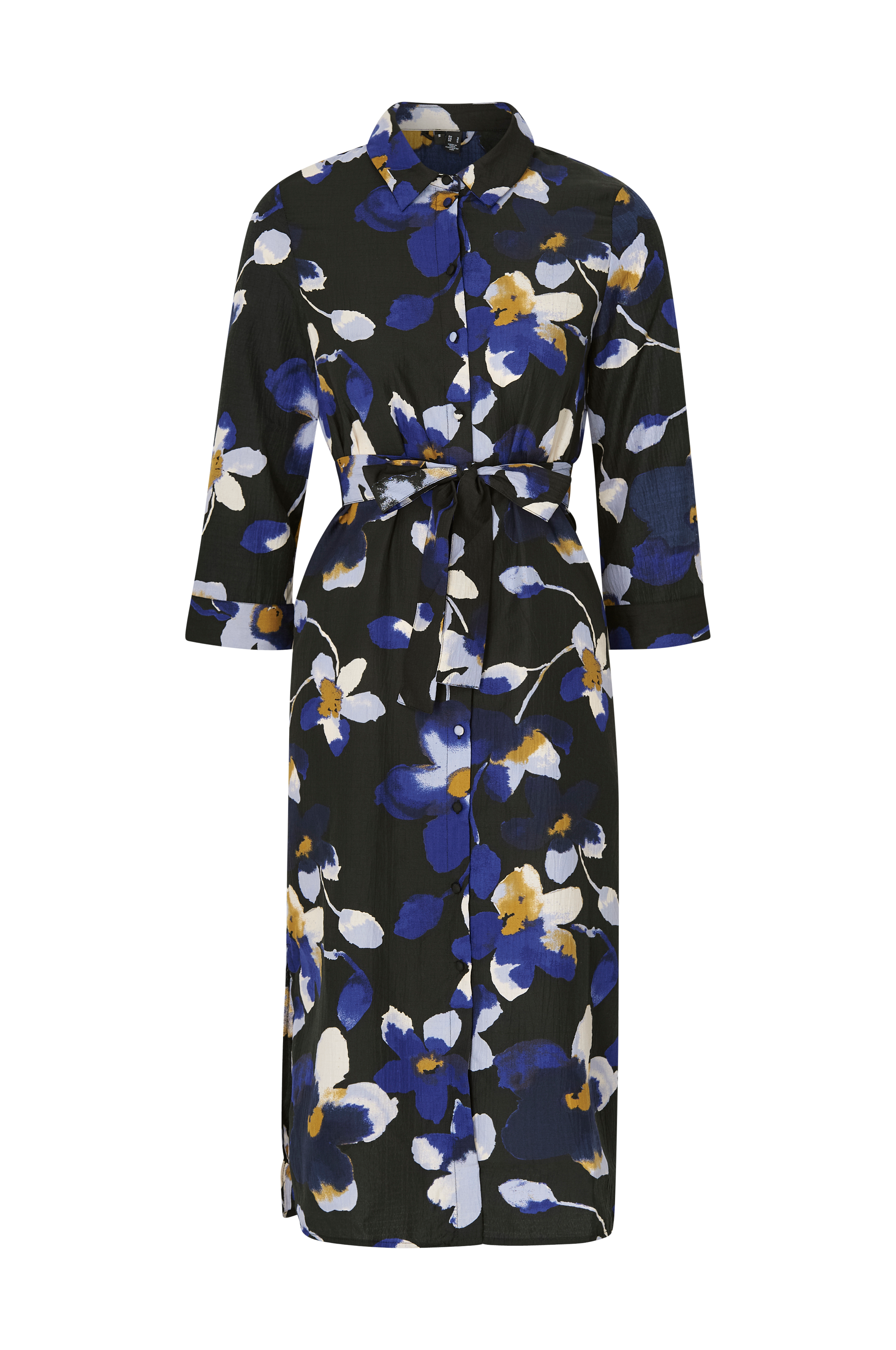• 3/4 lange ærmer med manchet ved manchetterne• Stofbetrukkede knapper foran• Bindebælte ved taljen• Slidser i siderne• Længde: 112 cm i størrelse S
