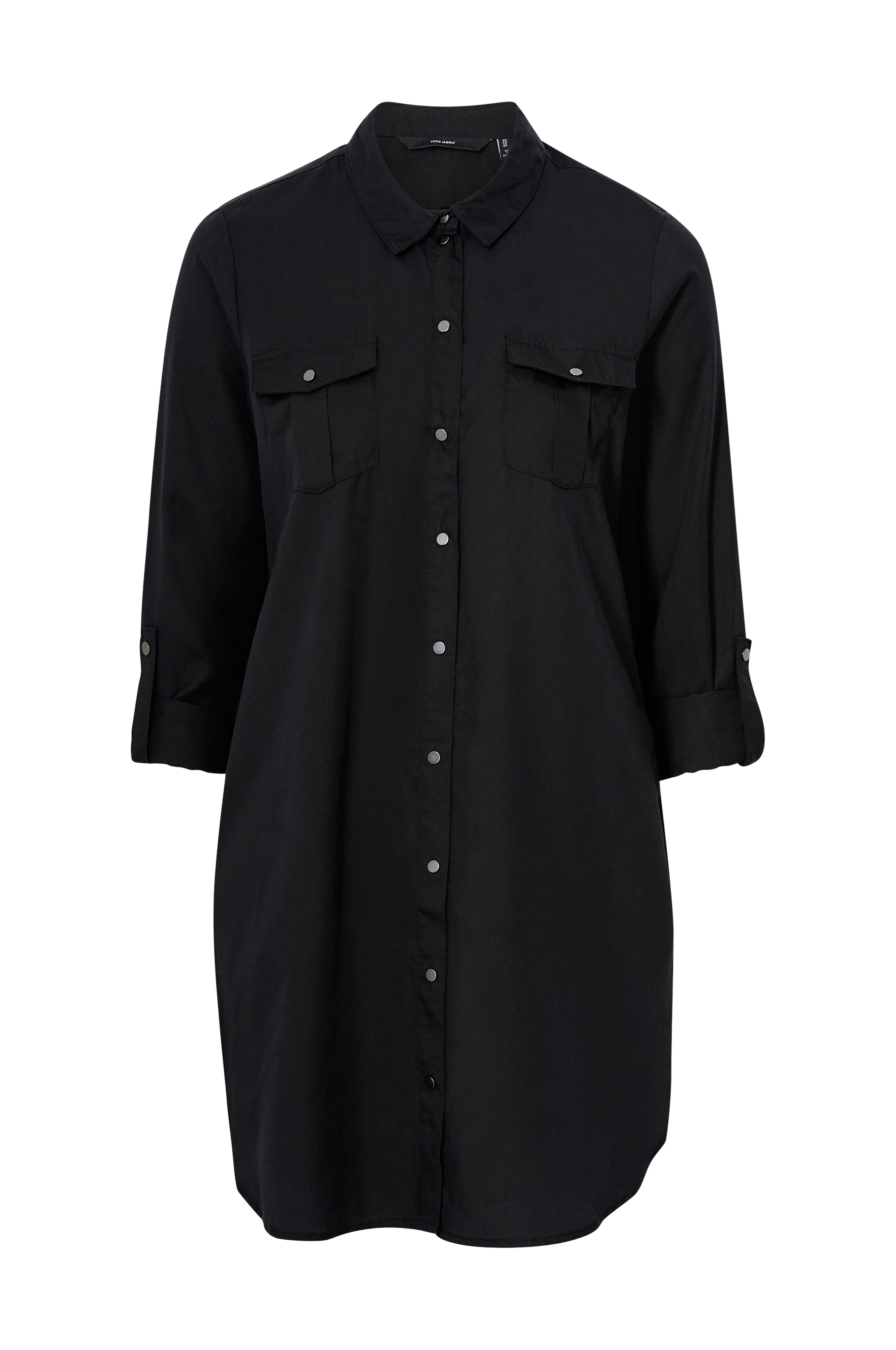 Skjortekjole vmSilla LS Short Dress fra Vero Moda i kort, lige model med trykknapper og to brystlommer. Langt ærme med manchet og trykknap samt indvendig tamp med trykknap for oprulning. Afrundet kant forneden og lommer i siderne. I blød, vævet kvalitet. Længde ca. 84 cm i str. S.