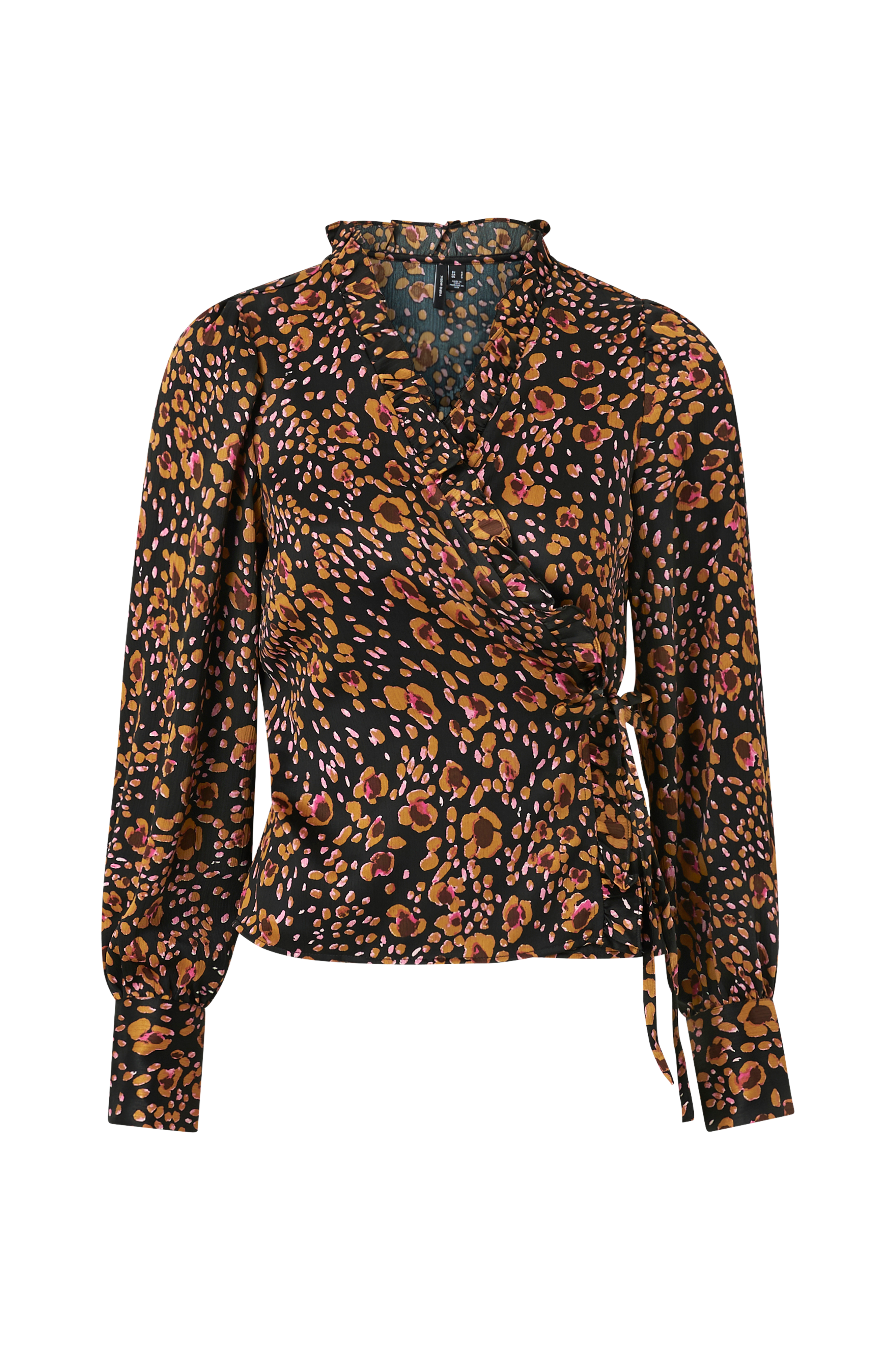 Slå om-bluse vmSandra Lillian L/S Wrap Top fra Vero Moda. Åben slå om-model i satin med smalt bindebånd i siden. Påsyet flæse i nakke og forkant samt lang pufærme med rynkning ved skulderen og bred manchet i ærmekant.