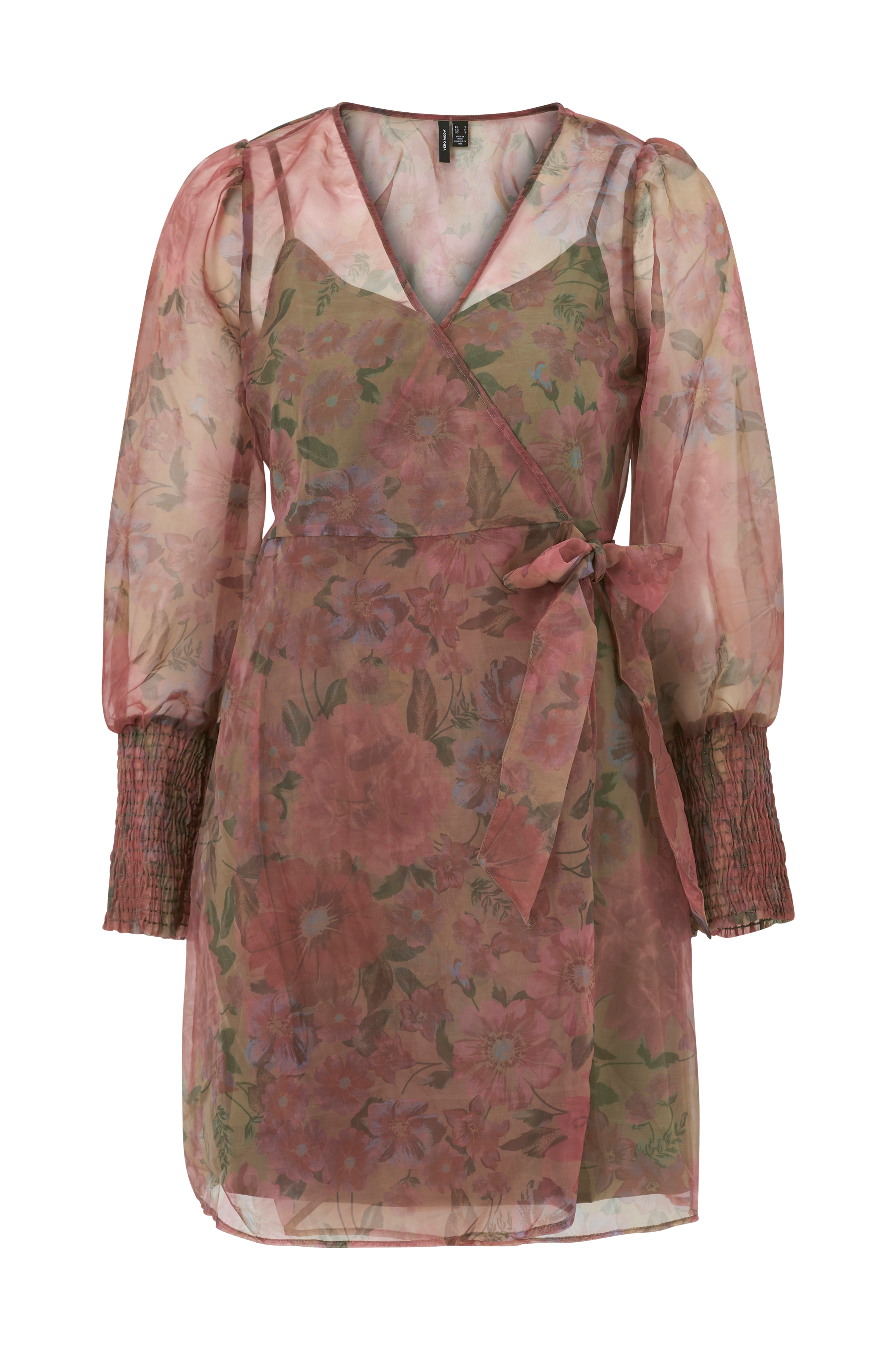 Slå om-kjole vmAbelia L/S Wrap Dress fra Vero Moda. Åben slå om-model i mønstret, vævet organza med afskæring i taljen og bindebånd i siden. Langt pufærme med rynkning ved skulderen og bred smockelastik i ærmekanten. Udtagelig, vævet underkjole som har smalle, regulerbare skulderstropper, V-formet halsudskæring og lige afskåret ryg. Længde ca. 90 cm i str. S.