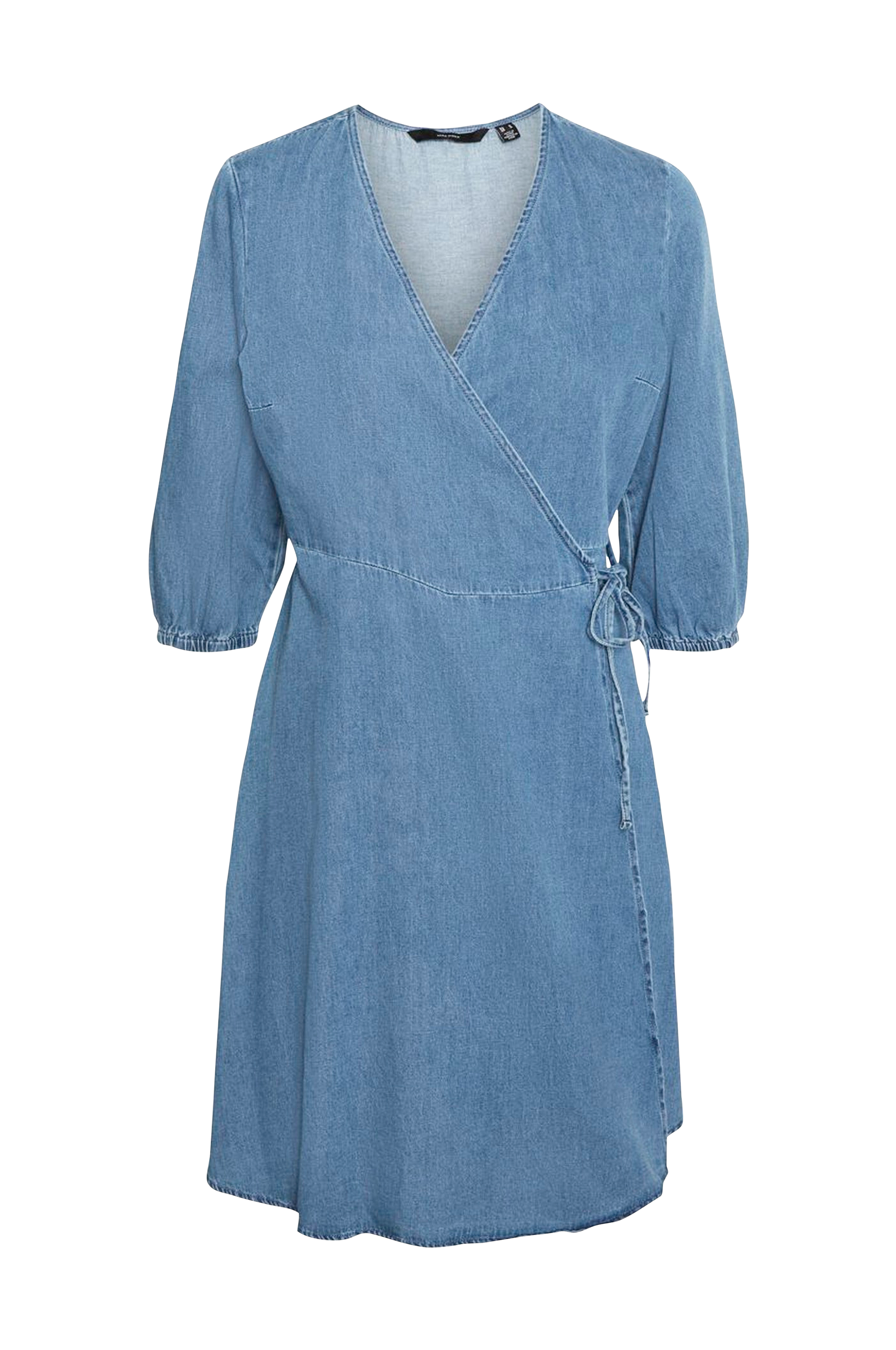 Slå om-kjole i vævet kvalitet af økologisk bomuld. Smalt bindebånd i den ene side og 3/4-lange ærmer med elastisk ærmekant. Længde ca. 87 cm i str. S.