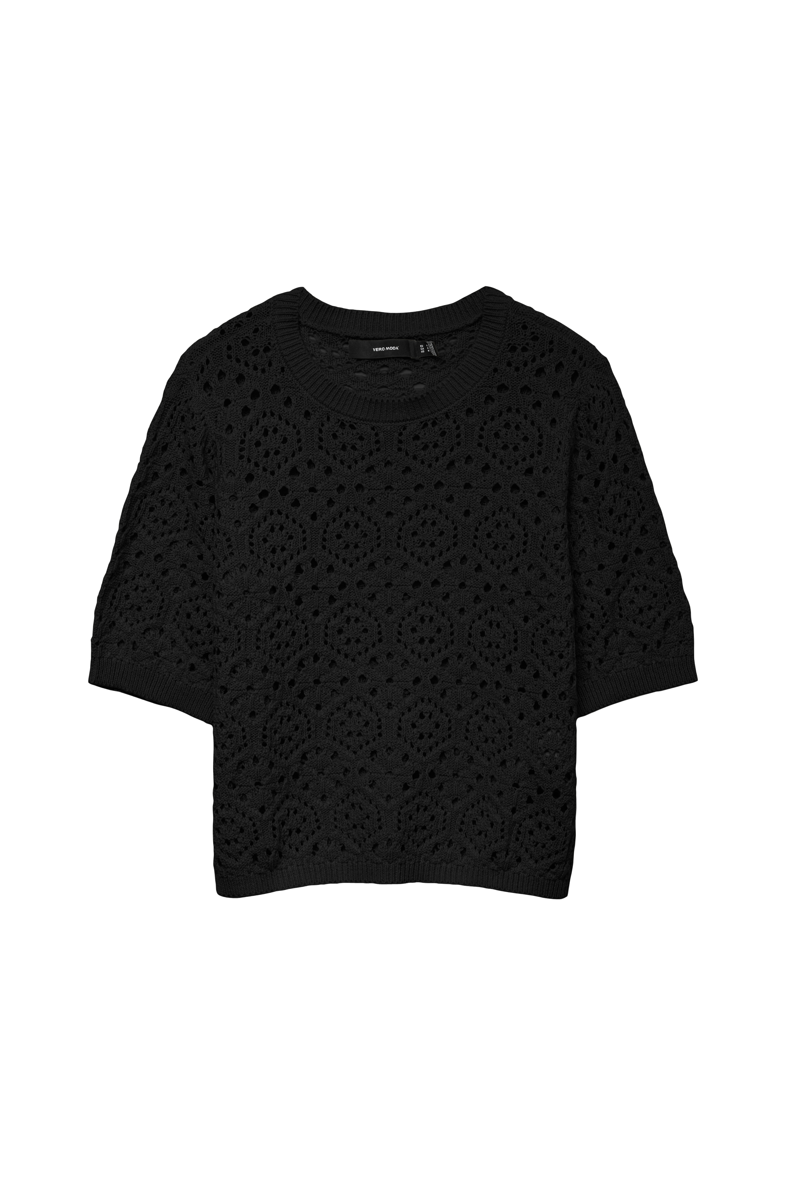 • Mønsterstrikket model• Rund hals med ribkant• Kort ærme• Ribstrik ved nederste kant og ved manchetterne
