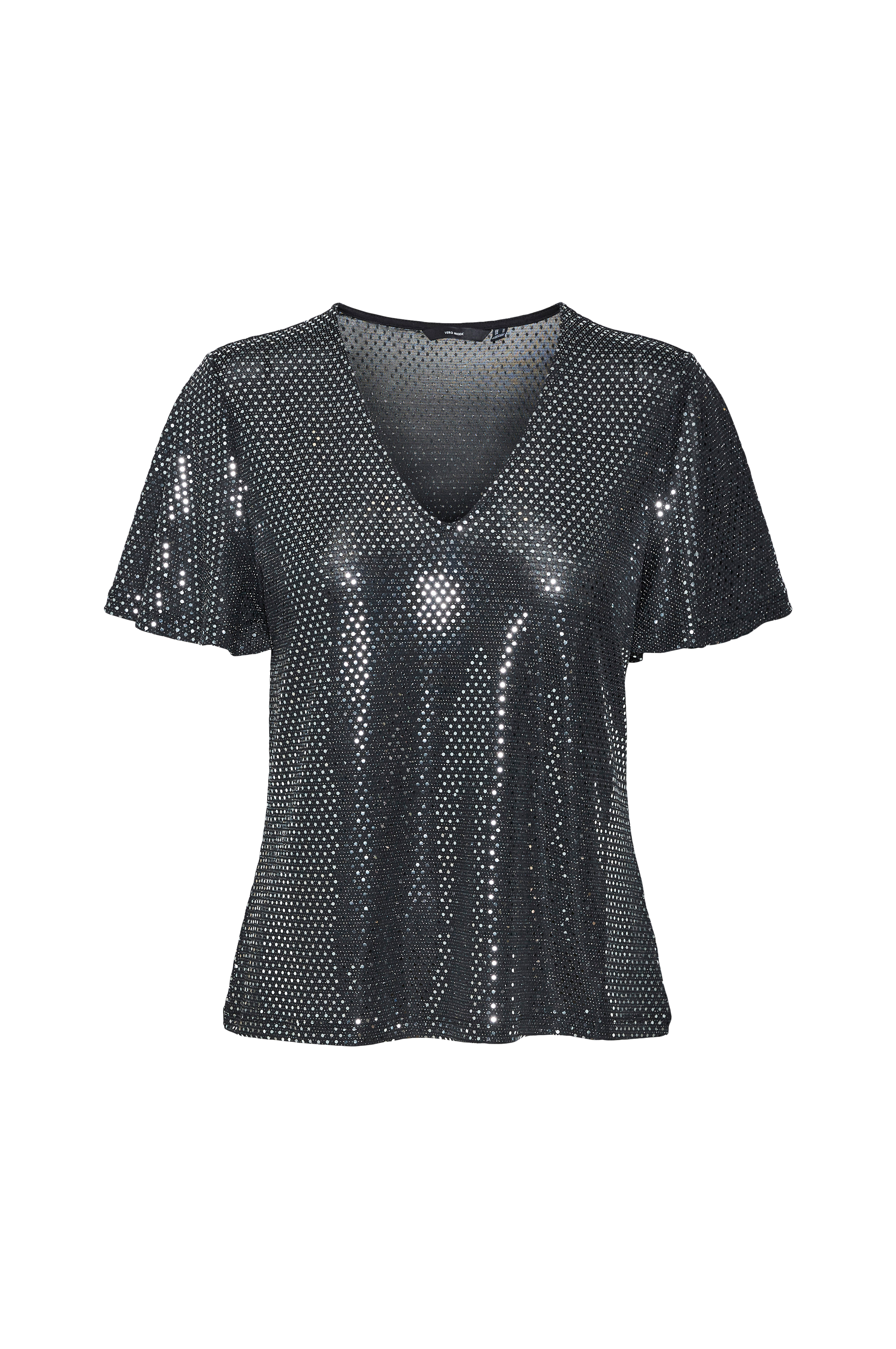 • Lidt transparent, glitrende model• V-formet halsudskæring• Kort, klokkeformet ærme