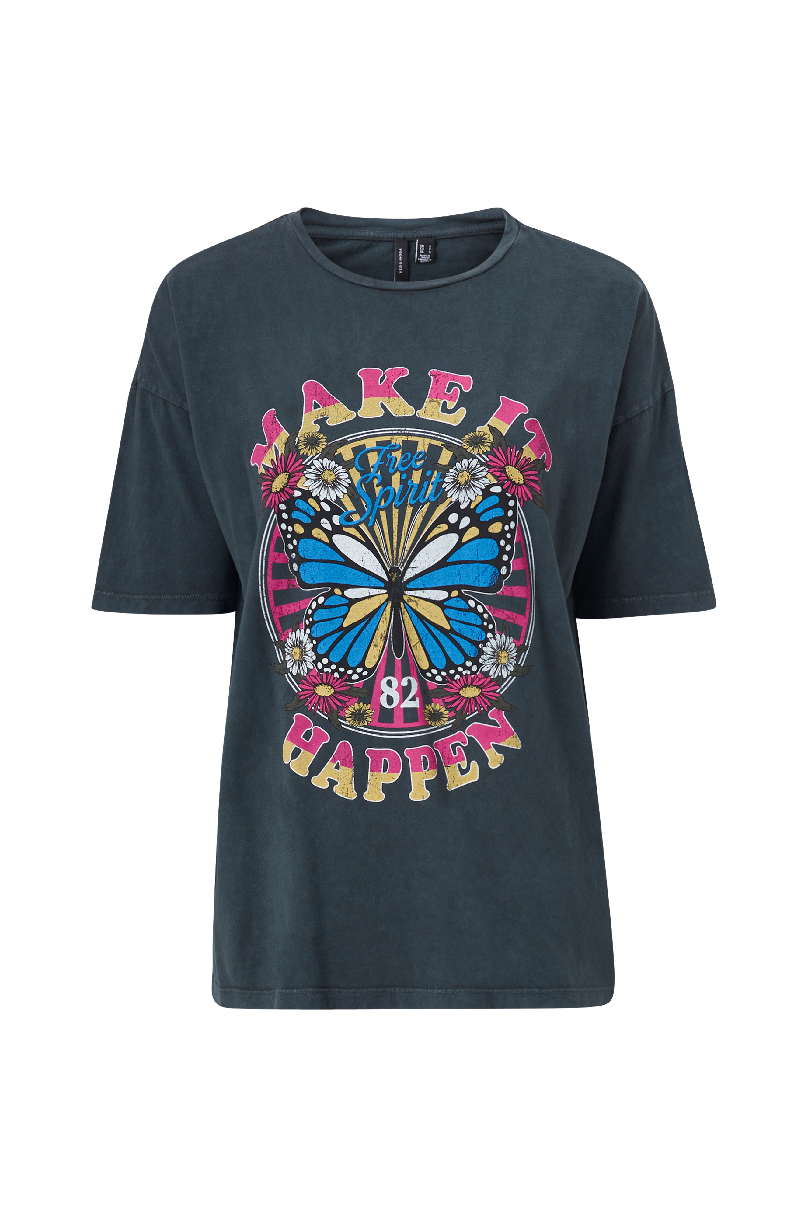• Lige model• Kort ærme• Rund hals med ribkant• Stort, multifarvet tryk foran