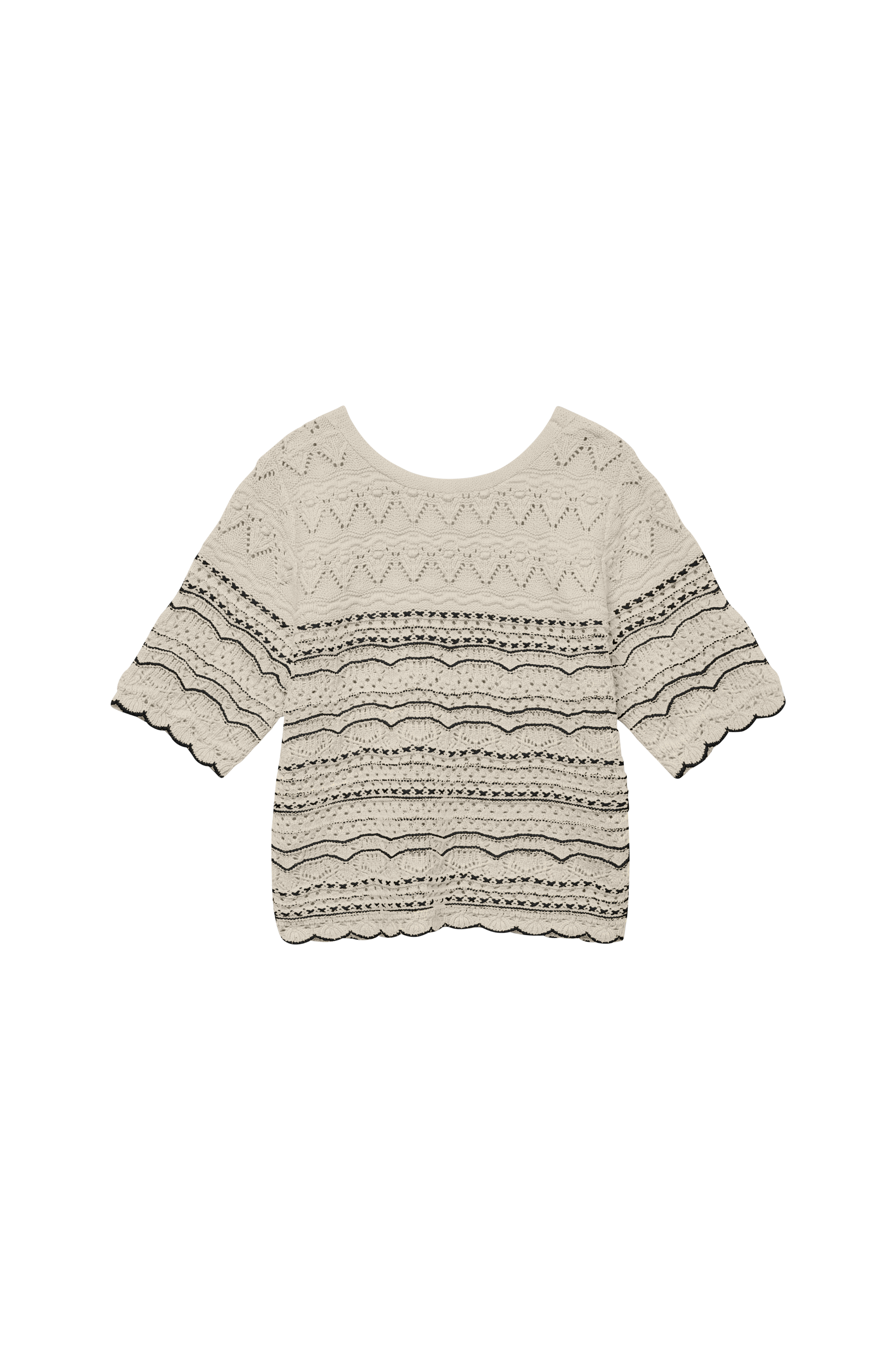 • Mønsterstrikket model• V-udskæring• Kort ærme• Bølgede kanter• V-udskæringen kan bæres foran eller bagpå