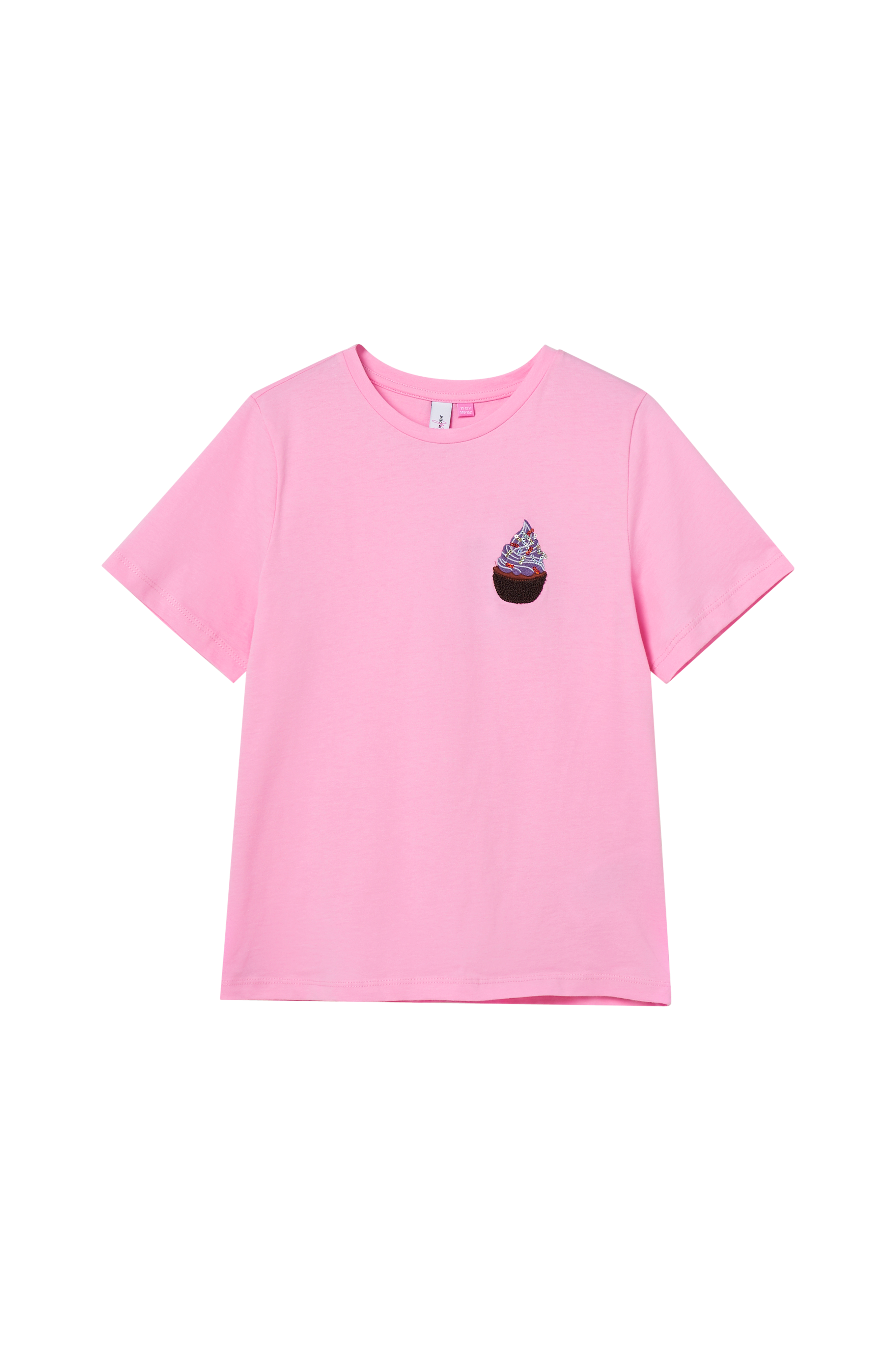 Kortærmet top i bomuld med rund halsudskæring. Applikation på brystet med broderi og pailletter.