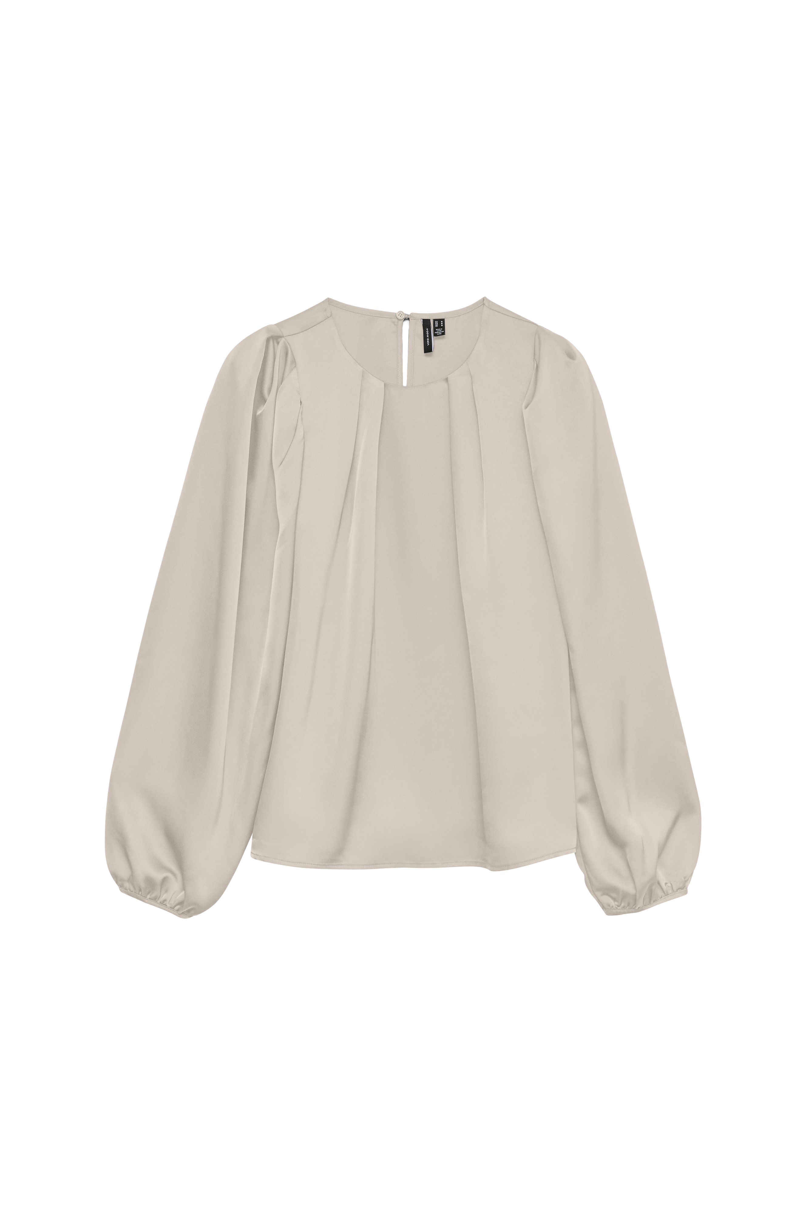 • Let skinnende top• Rund halsudskæring med knaplukning i nakken• Lange ballonærmer med elastik ved manchetterne• Drapering oppe foran• Normal pasform