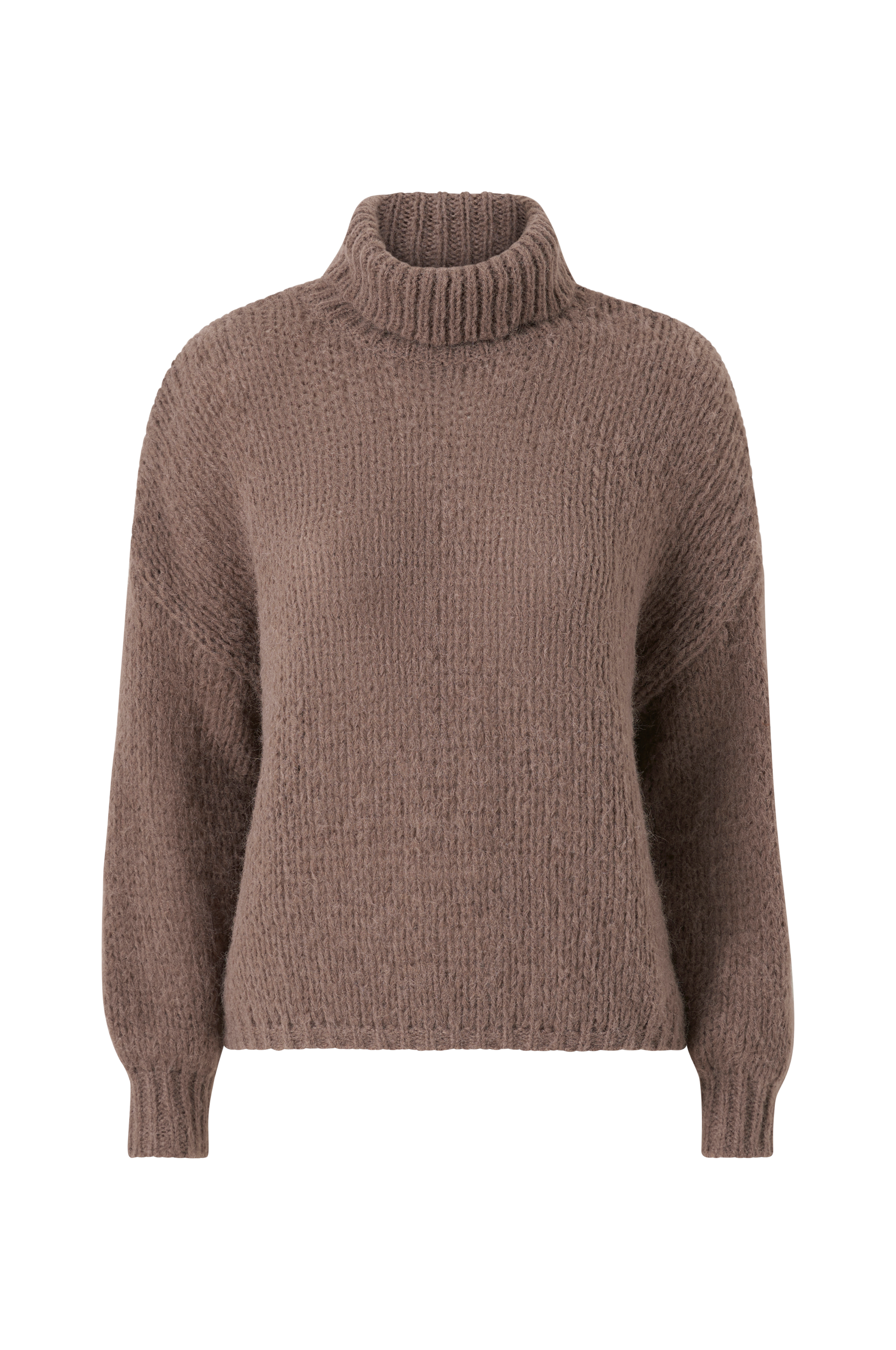 • Bred model med høj, ribstrikket krave• Nedsænket skulder med langt ærme• Ribstrik ved manchetterne og ved nederste kant