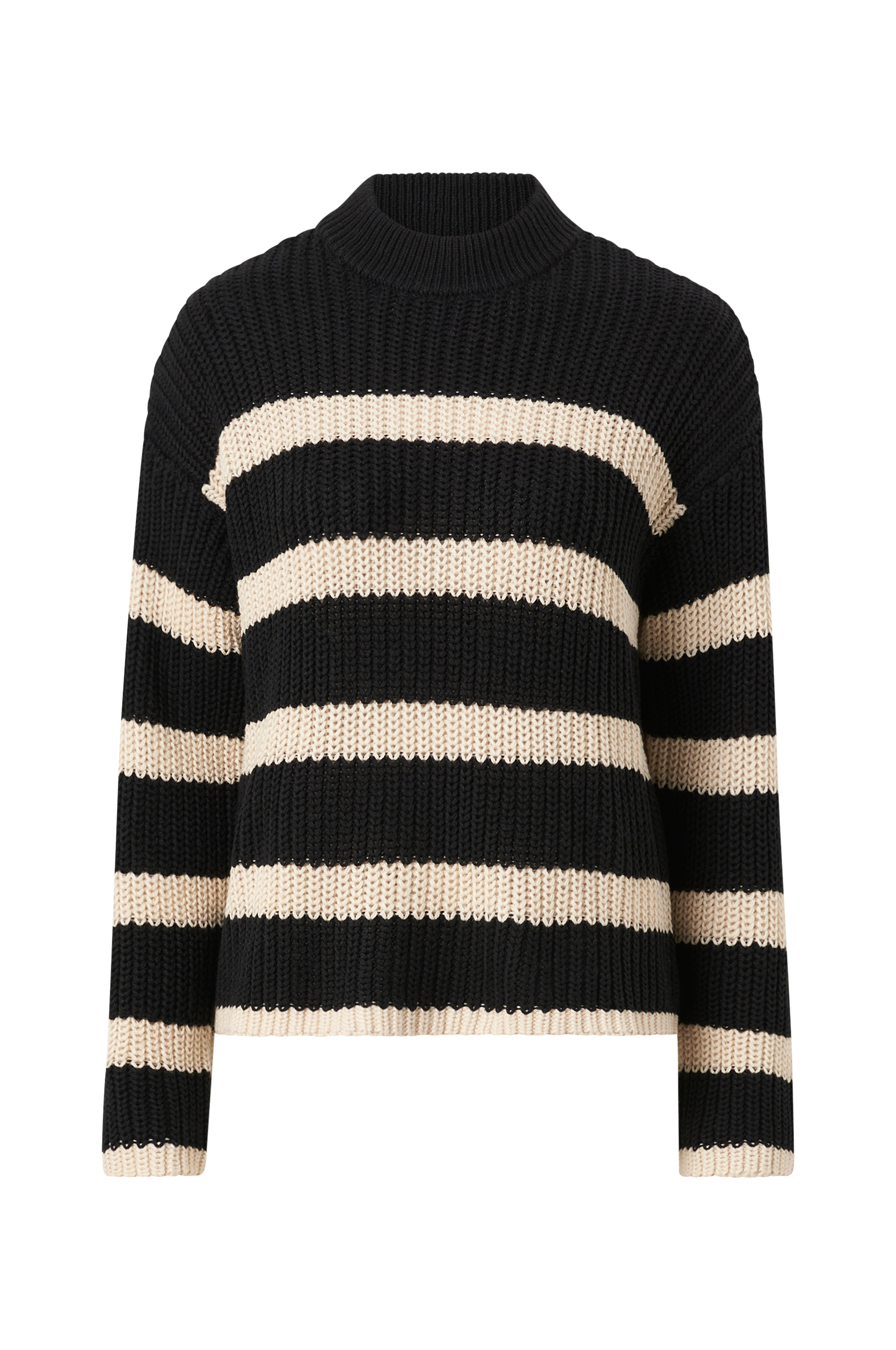 • Lige model med strikkede striber• Halvhøj, ribstrikket halsudskæring• Produktet indeholder genindvundet materiale, som genbruges for at reducere mængden af affald samtidigt med at der ikke anvendes nye ressourcer.