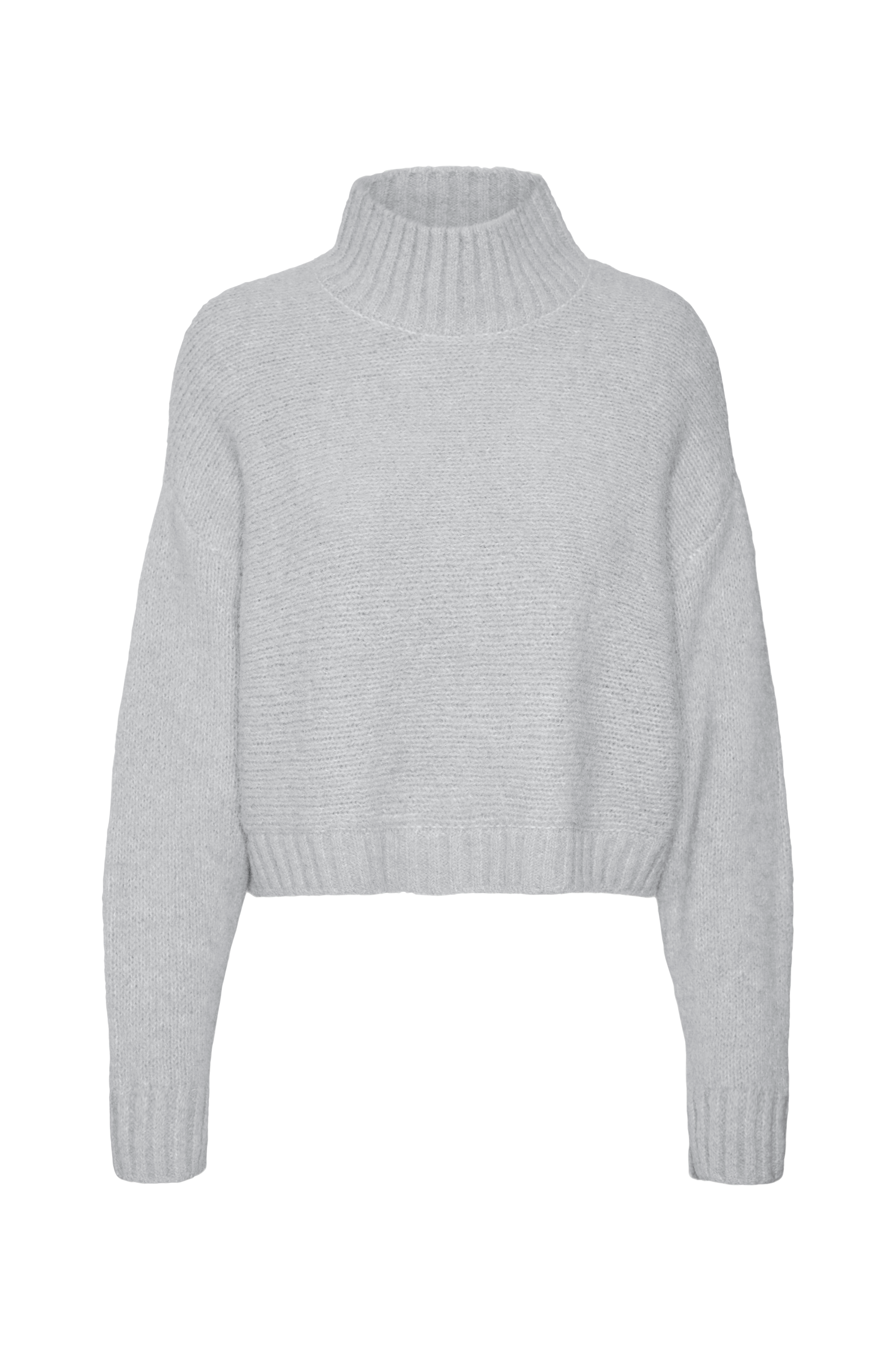 • Kort, bred model• Høj, ribstrikket krave• Nedsænket skulder med langt ærme• Ribstrik nederst og ved manchetterne